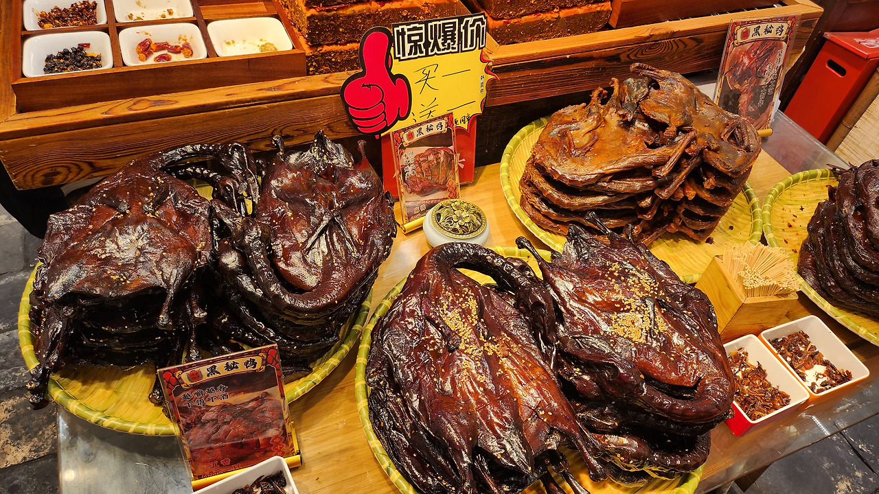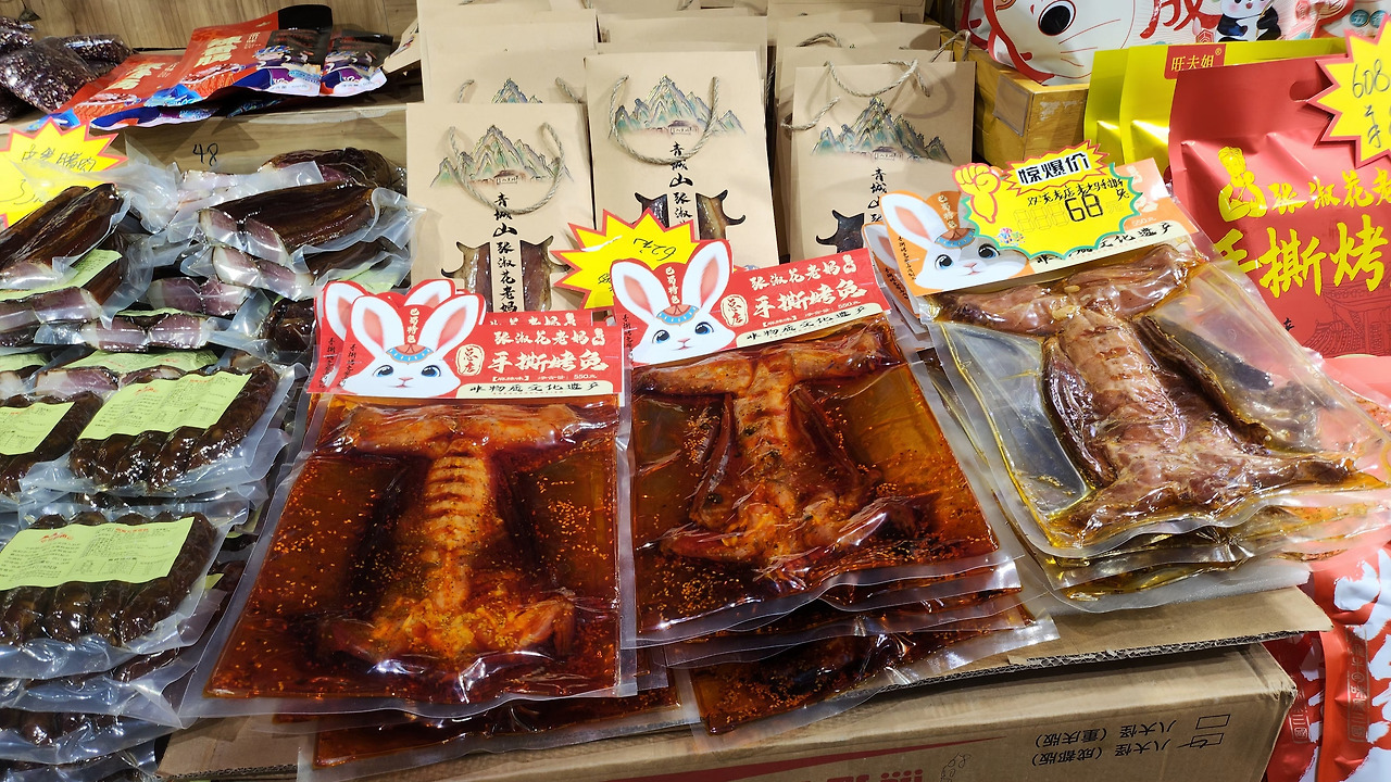 이번엔 오리다. 한 마리를 통째로 펴서 양념한 뒤 훈제한 '흑미오리(黑秘鸭)'. 비주얼은 더 참담하다. 밥반찬이나 맥주 안주로 먹는다. '보기도 좋아야 먹기도 좋다'란 말은 한국에서만 쓰는 건가? 오리고기니 맛은 있다. 육포보다 더 질기고 옅은 고소함이 느껴진다.