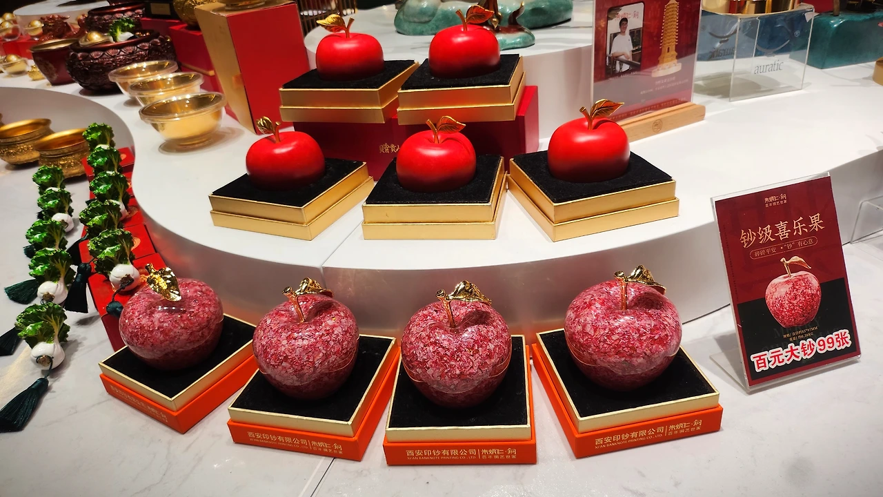 금빛 사치를 뒤로 하니 이번엔 부의 끝판왕이다. 이 사과는 직역하면 '기쁨의 열매'다. 100위안 화폐 99장(한화 약 200만 원)을 잘게 찢어 만들었다. "완전 돈지랄이네." 지하오가 못 듣게 한국어로 중얼거렸다. 이 사과는 붉은빛과 황금빛, 종잇돈까지 갖춰 중국인에게는 ‘복사과’나 다름없다.