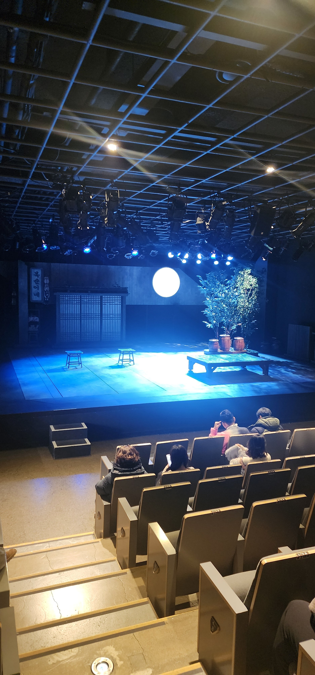 <꽃신>은 기존 '공연배달 서비스 간다' 작품에서 주로 선보이는 역동적인 피지컬 시어터(Physical Theater)의 요소는 거의 없습니다. 대신 무대의 가변성을 활용하여 시공간이 전환되는 방식으로 이야기가 전개됩니다. 이러한 연출은 복잡한 소품이나 과도한 배경 묘사 없이, 대사를 통해 관객들에게 인물의 감정과 사건을 직접적으로 전달하고자 하는 목적을 가집니다. 보편적이고 대중적인 방법으로 극을 전개하여 연극이 전하고자 하는 메시지에 관객이 온전히 집중하게 만듭니다.