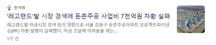 여기서 레고랜드 사태가 일어났다. PF를 아무도 투자하지 않는다. 단군 이래 최대 재개발 사업으로 불리는 둔촌 주공 재건축 개발사업도 PF에 실패하는 상황이다. 수익률이 그래도 어느 정도 보장되는 서울의 재개발 사업의 PF가 실패하면, 지방의 개발 사업들의 사정은 안 봐도 뻔할 것이다.
