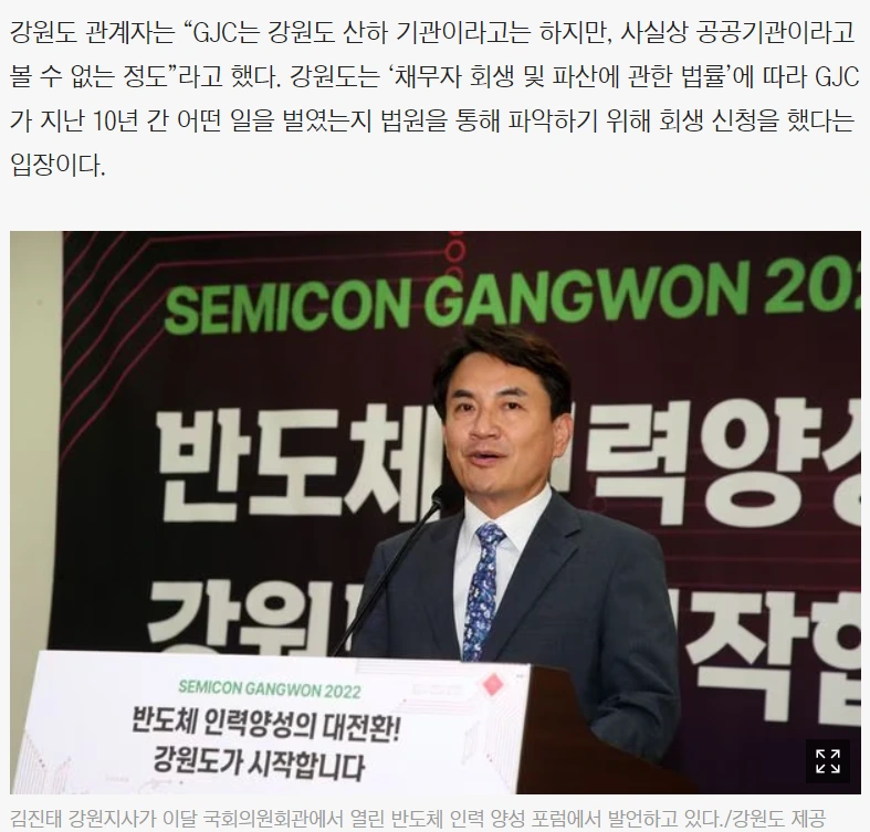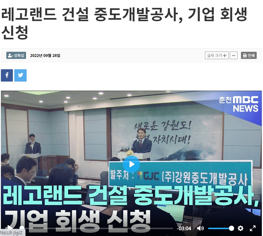 지난 6월 지방선거를 통해서 당선이 된 강원도지사 김진태 지사가 레고랜드 개발을 맡은 강원도 자회사 강원중도개발공사가 진 빚 2050억을 채무불이행 선언을 함과 동시에, 강원중도개발공사 회생신청을 청구했다.