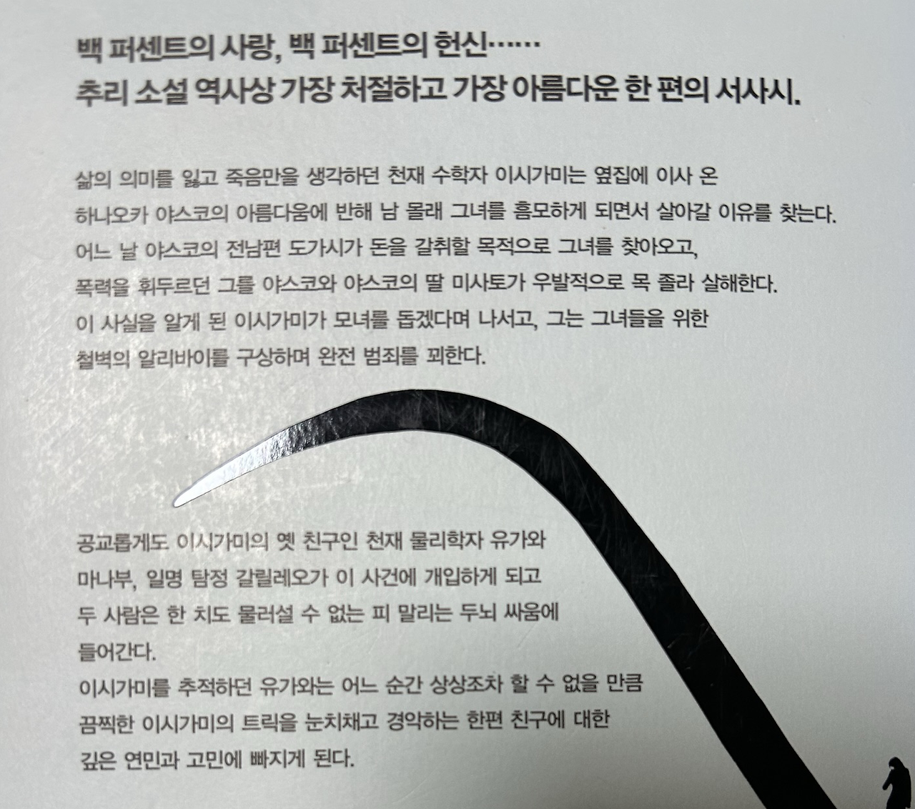 추리 소설 특성 상, 지나친 줄거리 설명은 스포일러가 되어, 소설을 읽는 즐거움을 해치기 때문에 책 뒤 표지에 있는 줄거리 설명을 첨부하겠다.