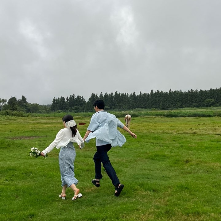 그렇게 꼬박 일 년이 지나, 촬영을 위해 제주에 왔다. 그리고 2023년 장마도 함께 왔다.ㅋㅋ 작가님은 우리가 제주에 오기 전부터 비가 많이 올 것이라며 걱정어린 연락을 주셨다. 하지만 안타깝게도 우리에게 다음은 없었다. 내 결혼 여정의 시작은 유월무드였기에. 속옷까지 다 젖는 한이 있어도ㅋㅋㅋ 한 장이라도 남겨야 했다.