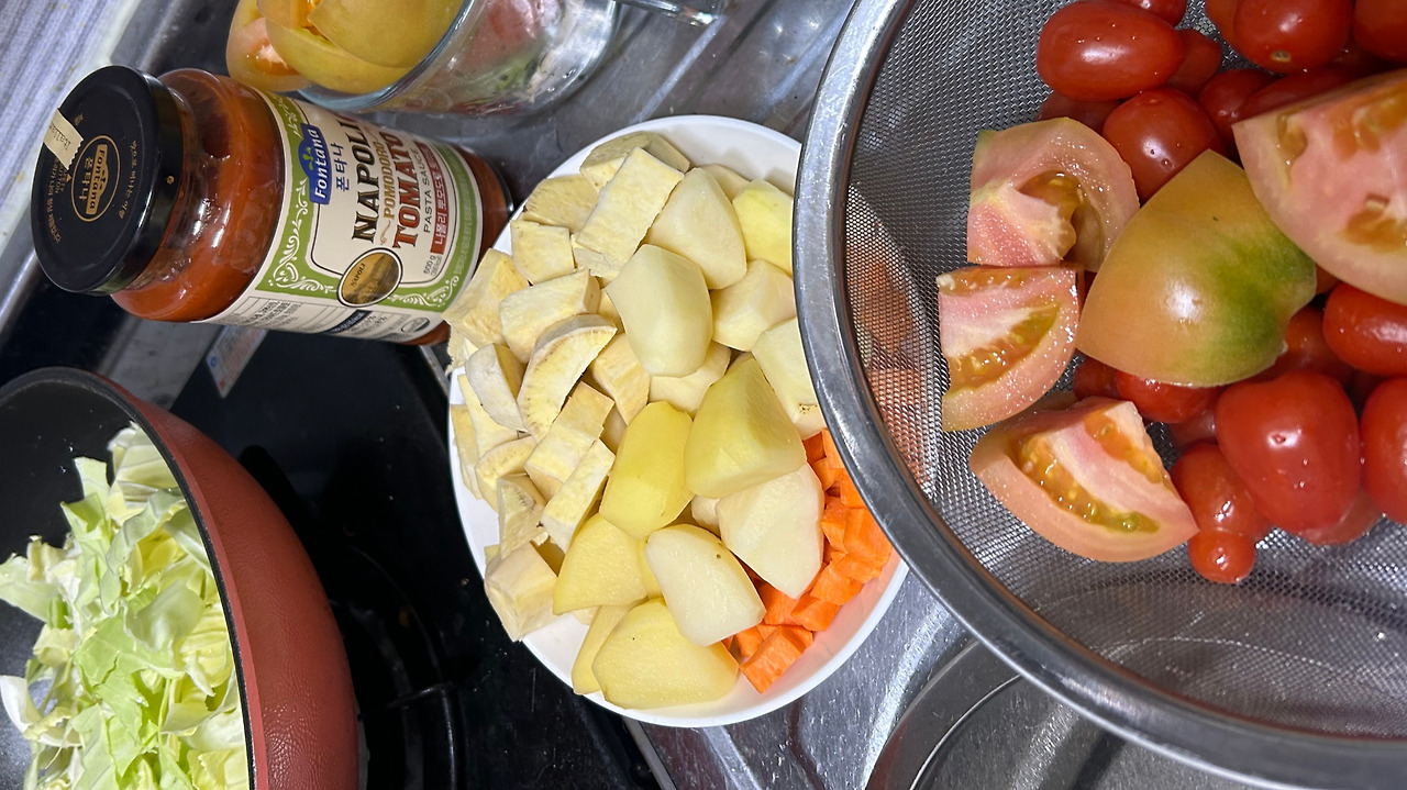 무려 마음을 다잡고, 주방에 섰다. 우선 핸드폰으로 보내주신 레시피를 켜놓고, 재료 손질을 시작했다. 양파를 자르고, 감자와 고구마 껍질을 필러로 깎아냈다. 감자는 나중에 으스러질 거라는 레시피 설명에도, 괜스레 기분을 내보고 싶어, 둥글게 깎았다. 당근을 자르고, 파슬리, 양송이, 양배추도 잘랐다. 중요한 포인트라고 하신, 후숙 하려고 밥 솥 위에 올려놓은 찰 토마토와 냉장고 한켠에서 쭈굴쭈굴해지고 있는 방울토마토들도 준비했다.