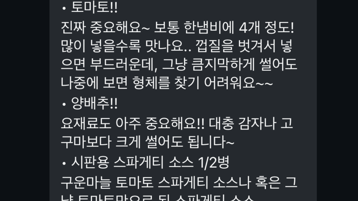 사실, 유튜브나 인터넷 사이트를 공유해 주셨다면, 해 먹지 않았을 거다. 보기보다 재료도, 손도 많이 가보였다. 그런데, 하나하나 일일이, 그 단계의 주의사항, 예컨대, '야채에서 수분이 나오니까 물을 많이 넣으면 안 된다.', '양배추까지 넣으면 냄비가 넘칠 것 같은 위기의식을 느낄 수 있다.'같은 것까지 적어주셨으니, 응당 그 정성에 보답하기 위해서라도 해 먹어야 했다. 평일 저녁 퇴근 후에 먹으려면, 적어도 밤 10시가 돼서야 먹을 수 있을 것이 분명했으므로 주말을 기다렸다.