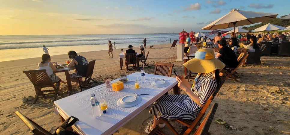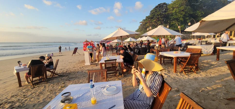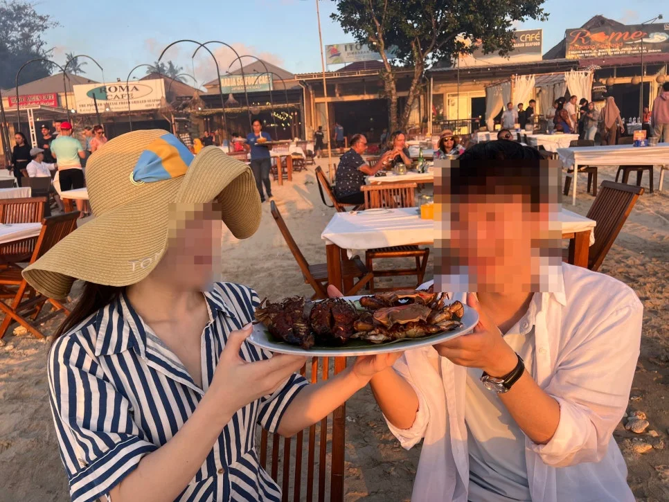 마사지까지 마친 우리는 이제 저녁을 먹으러 짐바란 씨푸드로 이동했다. 정말 넓은 해안가에 야외 해물 구이집이 아주 빼곡히 늘어서있는 곳이었다. 정말 테마파크가 아닌가 생각이 들 정도로 사람이 많았는데 이곳의 노을을 보며 식사를 하는 것이 그만큼 로맨틱한 일이기 때문일 것이다.