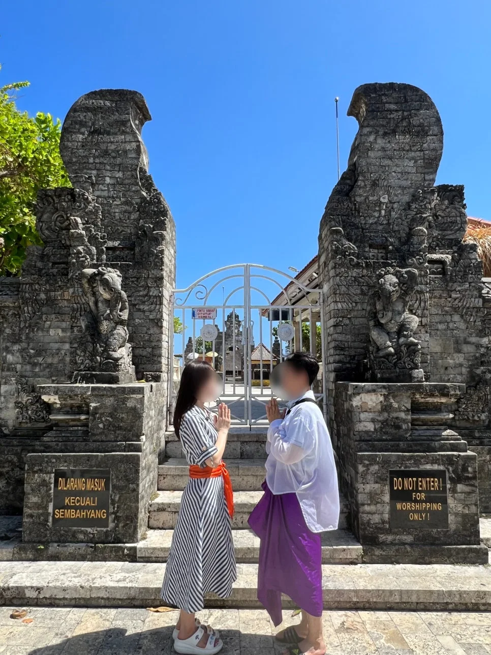 그래서 울루와뚜 사원에 대한 마음을 접어야하나 라고 생각하던 중 남길이 원숭이는 본인 선에서 정리해주겠다고 하자 나는 다시 욕심이 생겨났다. 그래서 아내를 열심히 설득하고서 이 곳에 도착할 수 있었다. 이 사원은 성지라서 맨다리가 보이면 안된다고 한다. 그래서 남자도 저렇게 보라색 치마를 입어야 하고 허리에 띠를 둘러야 한다.