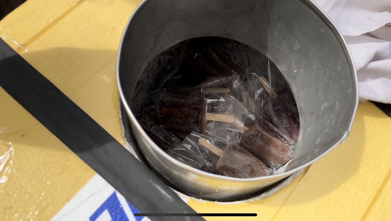 수제 아이스께끼. 흠칫 놀랍지만 이미 안 산다고 하기도 미안해서, 남은 것도 중에 고른다. 주황색은 많이 남았고 보라색이 하나 남아있었다. 원통 안으로 손을 넣자 차가움이 느껴진다. 최첨단 이동식 냉동고.