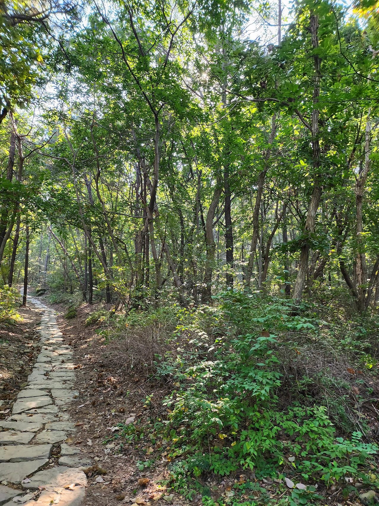 돌바닥 오르막이 나타나면 산의 아름다움은 등산화의 밑창에 부딪힌다. 주말 오전의 어중간한 시간이라서인지 이 지점을 지나는 사람들은 거의 없다. 조금 오르면 돌탑이 있고 쉼터가 있다. 사람들은 이곳에서 숨을 고르며 쉬어간다. 이 지점부터 본격적인 오르막길이 시작되는데 계단 길이다. 45도쯤의 가파른 계단 길이라 숨이 가빠지려고 할 때쯤 이미 심학산의 정상 하늘이 보인다.