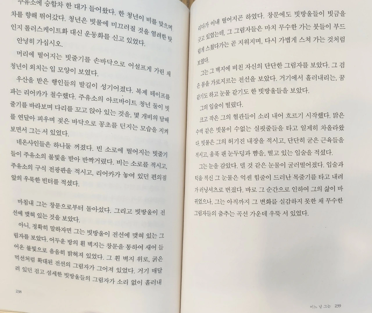 예전에 쓴 소설이면 어떤가. 밀폐된 방의 눅눅한 창문을 열고 공기가 바뀌고 햇빛이 쏟아져 들어오든 한 강 작가의 문장이 가늘고 섬세하며 한지의 종잇장처럼 얇게 펄럭이는 문장으로 내게 펄럭이며 안겨오는 것이 중요할 뿐.