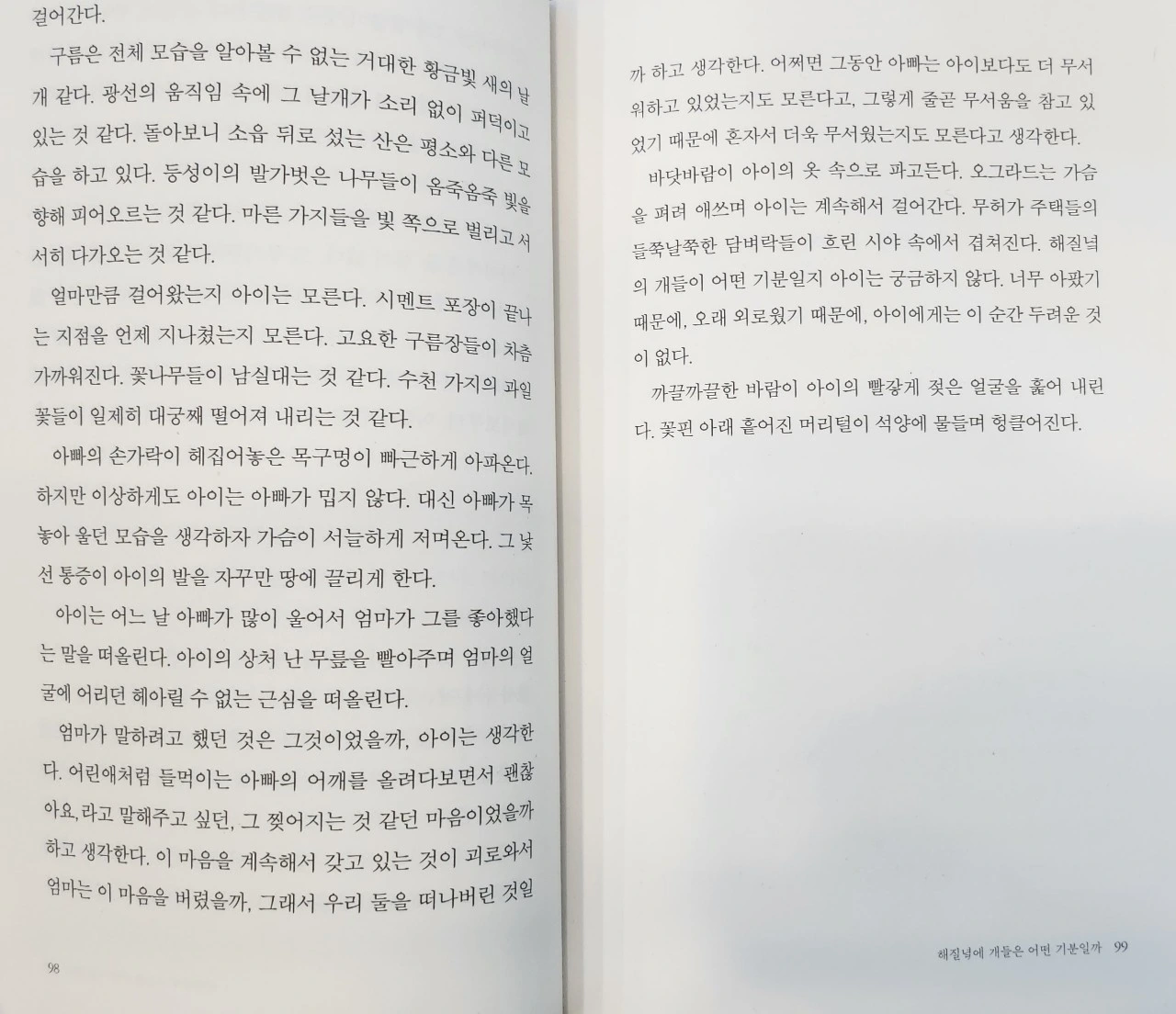 아이는 개들의 등 뒤로 얼핏 봤던 흙펄을 떠올렸다. 물기를 머금어 마치 곱게 빻은 유릿가루 같던 그 흙벌에 비칠 황금빛 구름의 무늬를 상상하자, 아이의 가슴은 좀 전까지의 놀람이 아닌 이상한 설렘으로 뛰기 시작했다. 저 하늘 안에 무엇이 있어서 저런 빛이 배어 나오는 걸까. 저렇게 잠깐 동안만 빛을 내보내곤 사라져 버리는 걸까. 바다까지 걸어가면 그걸 알 수 있을까, 하고 아이는 생각했다. 저 빛이 어디서 나와서 어디로 들어가는지 볼 수 있을까. <해 질 녘에 개들은 어떤 기분일까, 47쪽>