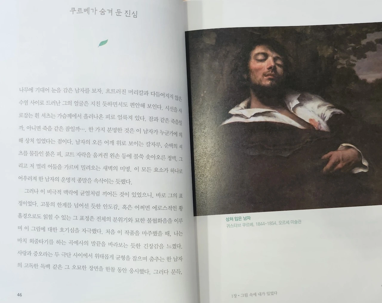 그림을 찬찬히 살펴보면서 작가의 감정을 느껴볼 수는 있겠다는 생각이 들었는데 마침 책에는 귀스타브 쿠르베가 그린 <상처 입은 남자, 1844~1854>가 등장했다. 이 작품은 귀스타프 쿠르베의 자화상이라고 한다. 내 마음을 알기나 하는 것처럼 작가는 그림을 바라보는 것부터 말하고 있다. 그의 표정을 보고 느껴지는 호기심에 대한 묘사도 있었다. 나는 작가가 말하려는 그림 속의 남자를 묘사하는 문장이 참 좋았다.