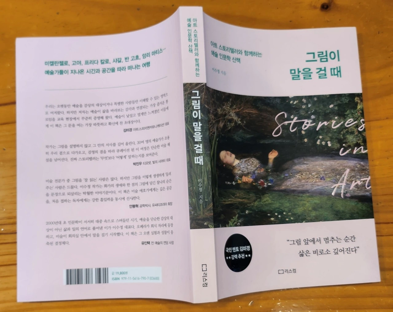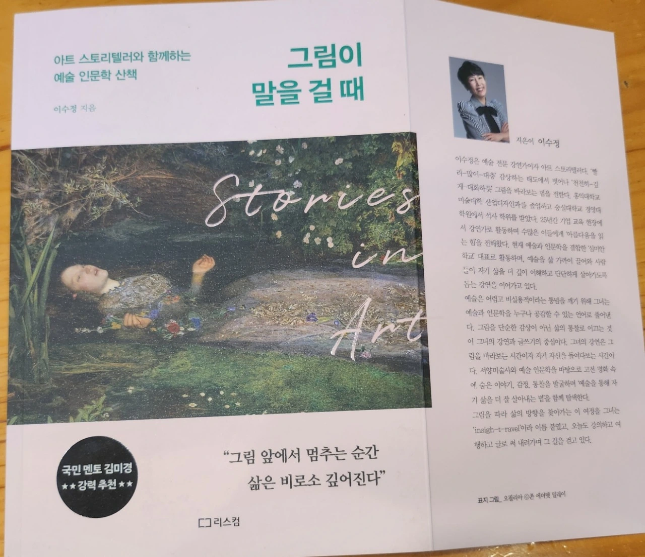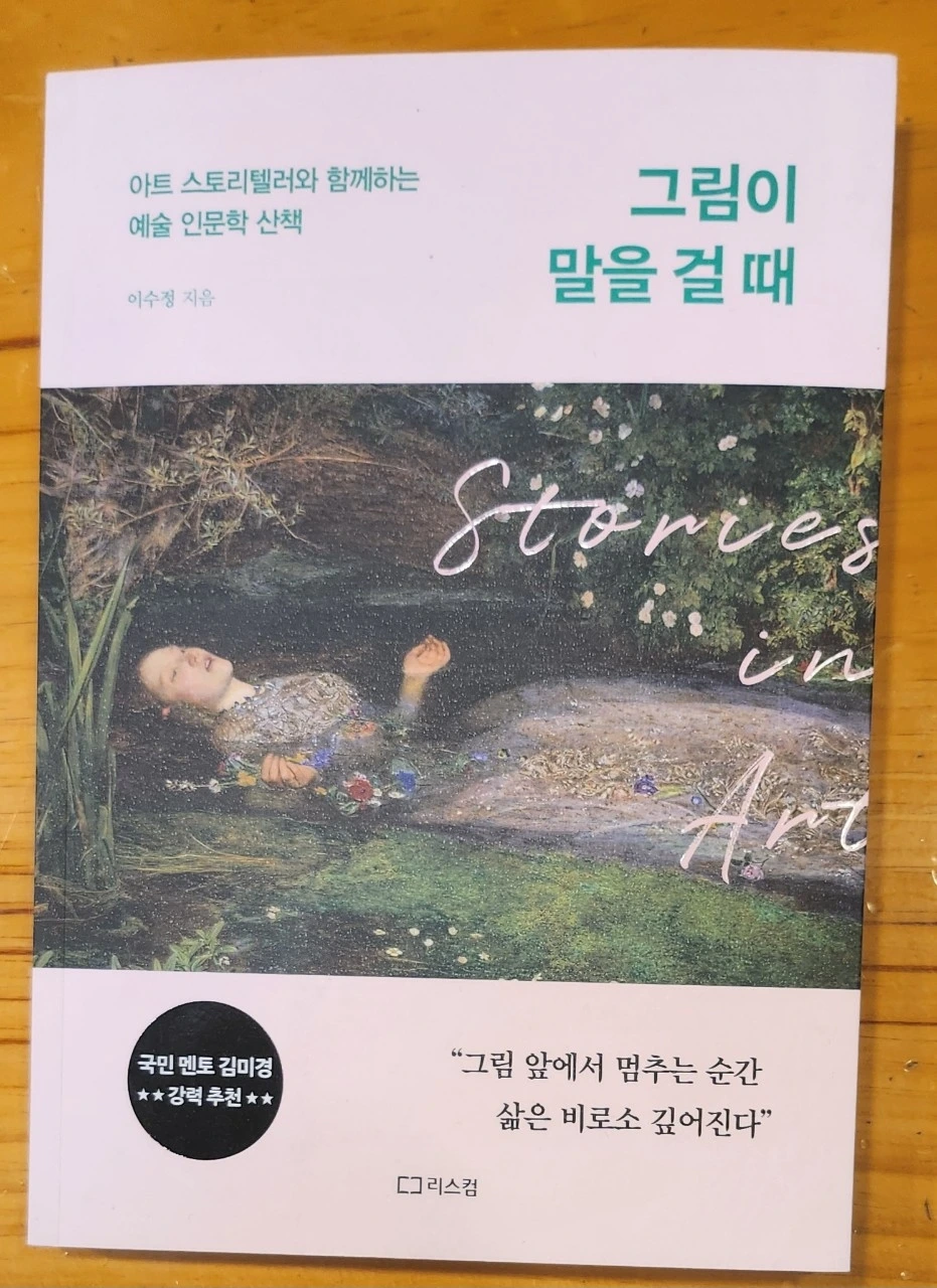예술 인문학 감성이 가득한 책 <그림이 말을 걸 때, 이수정, 리스킴, 2025>를 읽었다. 이 책의 지은이 이수정 작가님은 예술 전문 강연자이자 아트 스토리텔러다. 천천히 깊게 대화하듯 그림을 바라보는 법을 전한다. 그림을 통해 자기 자신을 들여다보는 시간을 지향한다. 강의하고 여행하고 글 쓰며 지내는 분이다. 미술이 미술관의 그림과 조각품 이상의 철학을 갖는다면 작품 안에 깃들인 이야기 때문일 것이다.