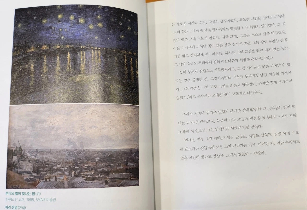고흐가 그린 밤하늘의 별은 고흐의 삶을 모르면 그 별빛이 눈물 빛이라는 것을 알 수 없을 것이다. 밤하늘의 별이 고흐의 눈물 때문에 더욱 아른거리며 빛났을 것이라는 이야기가 27쪽 하단부에 있다. 그럴 수도 있었겠다는 생각에 이르자 작가의 현실이 그림 속에 녹아있었겠구나! 하는 생각도 들었다. 그렇다면 그림을 감상하려면 반드시 작가를 알아야만 할까? 이런 생각이 들자, 책을 읽는 마음이 좀 무거워졌다.