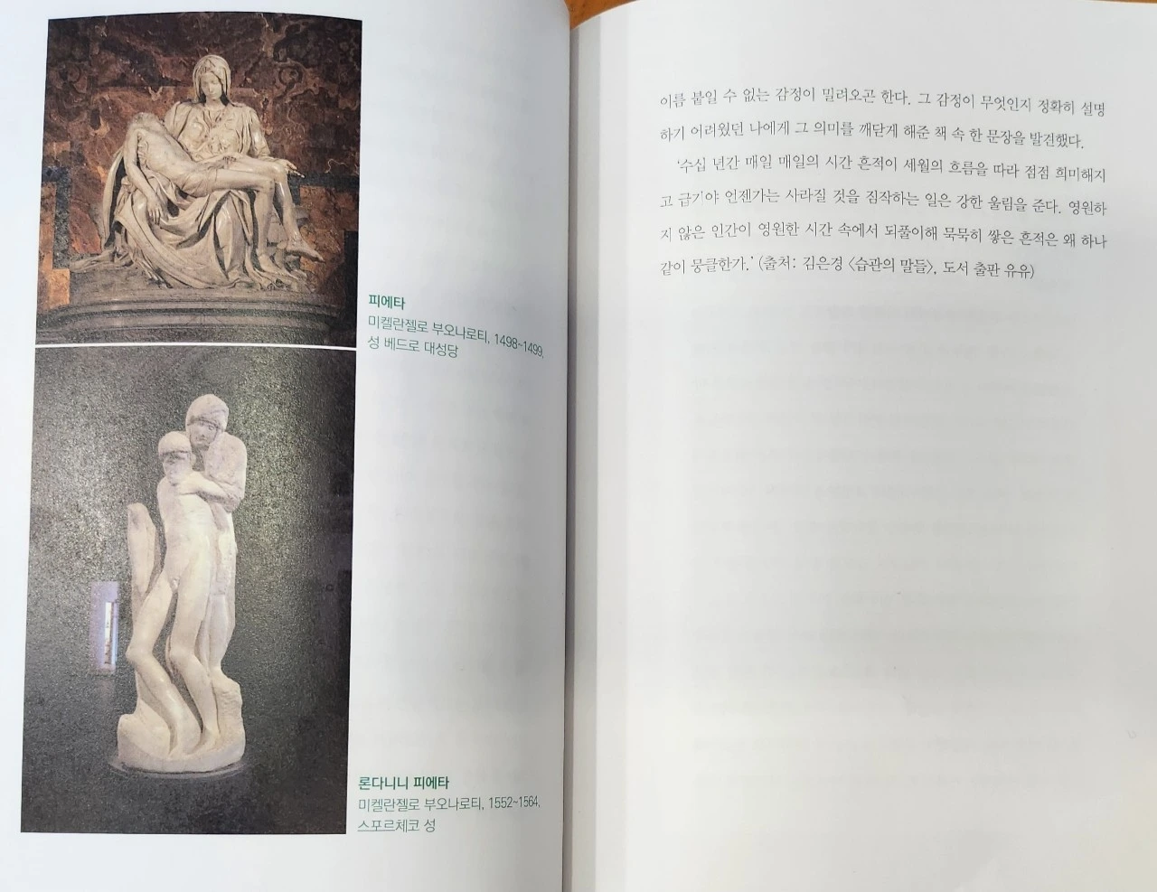 내가 사랑하는 인상주의 화가 모네는 등장하지 않았지만, 샤갈이 등장했고, 라파엘로가 왜 미혼으로 살다가 죽었는지도 알게 되었다. 그리고 미켈란젤로의 두 번째 작품 피에타가 미완으로 말없이 등장했다. 두 장면이 한 페이지에 있는 것만으로도 미켈란젤로의 피에타에 대해 더욱 처절한 아픔이 느껴지는 것에 대해 누구라도 공감했을 것이다.
