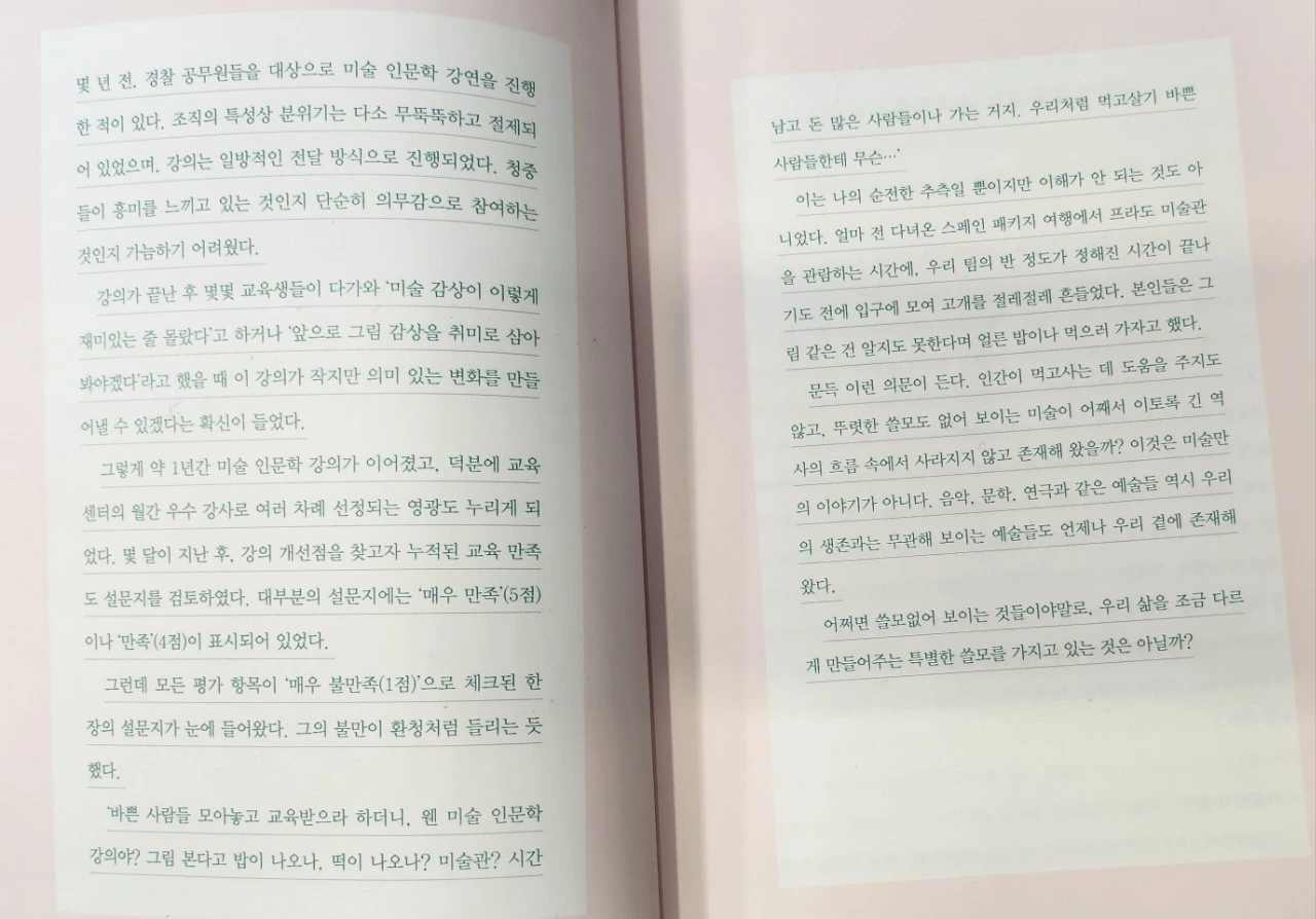 문득 이런 의문이 든다. 인간이 먹고사는 데 도움을 주지도 않고, 뚜렷한 쓸모도 없어 보이는 미술이 어째서 긴 역사의 흐름 속에서 사라지지 않고 존재해 왔을까? 이것은 미술만의 이야기가 아니다. 음악, 문학, 연극과 같은 예술들 역시 우리의 생존과는 무관해 보이는 예술들도 언제나 우리 곁에 존재해 왔다. 어쩌면 쓸모없어 보이는 것들이야말로, 우리 삶을 조금 다르게 만들어주는 특별한 쓸모를 가지고 있는 것은 아닐까? 19쪽