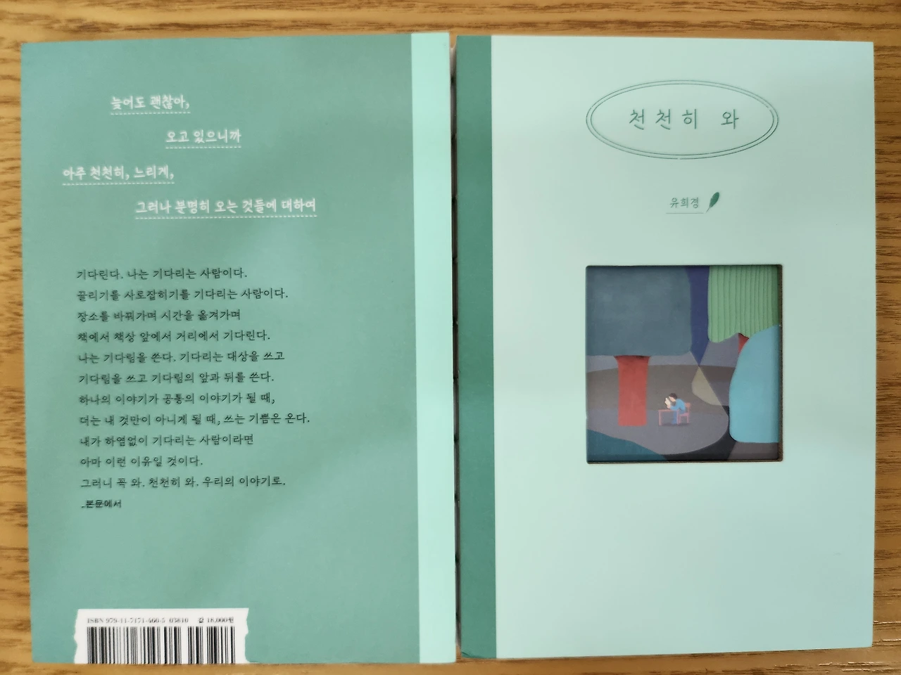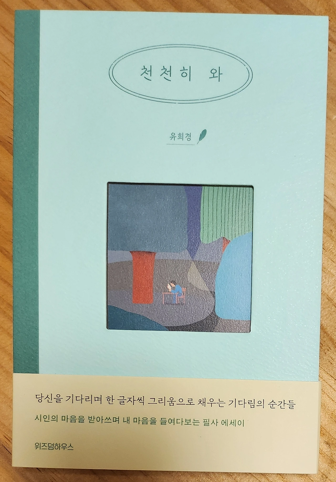 <천천히 와, 유희경, 위즈덤하우스>가 집에 도착했다. 책은 단단한 커버를 뚫고 마음을 연결하듯 창이 나 있었다. 내가 바라보는 창밖에는 무아지경으로 책을 읽는 한 사람이 있는데 그 사람이 이 책의 작가님인지 아니면 저 창 안에서 바라보는 나인지 언뜻 헷갈렸다. 제목에는 두 개의 동그라미가 쳐져 있었다. 이렇게 말하는 소리가 들리는 듯했다. 천천히 와.