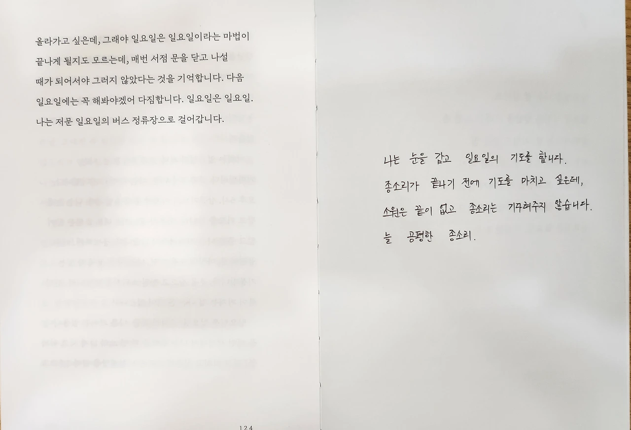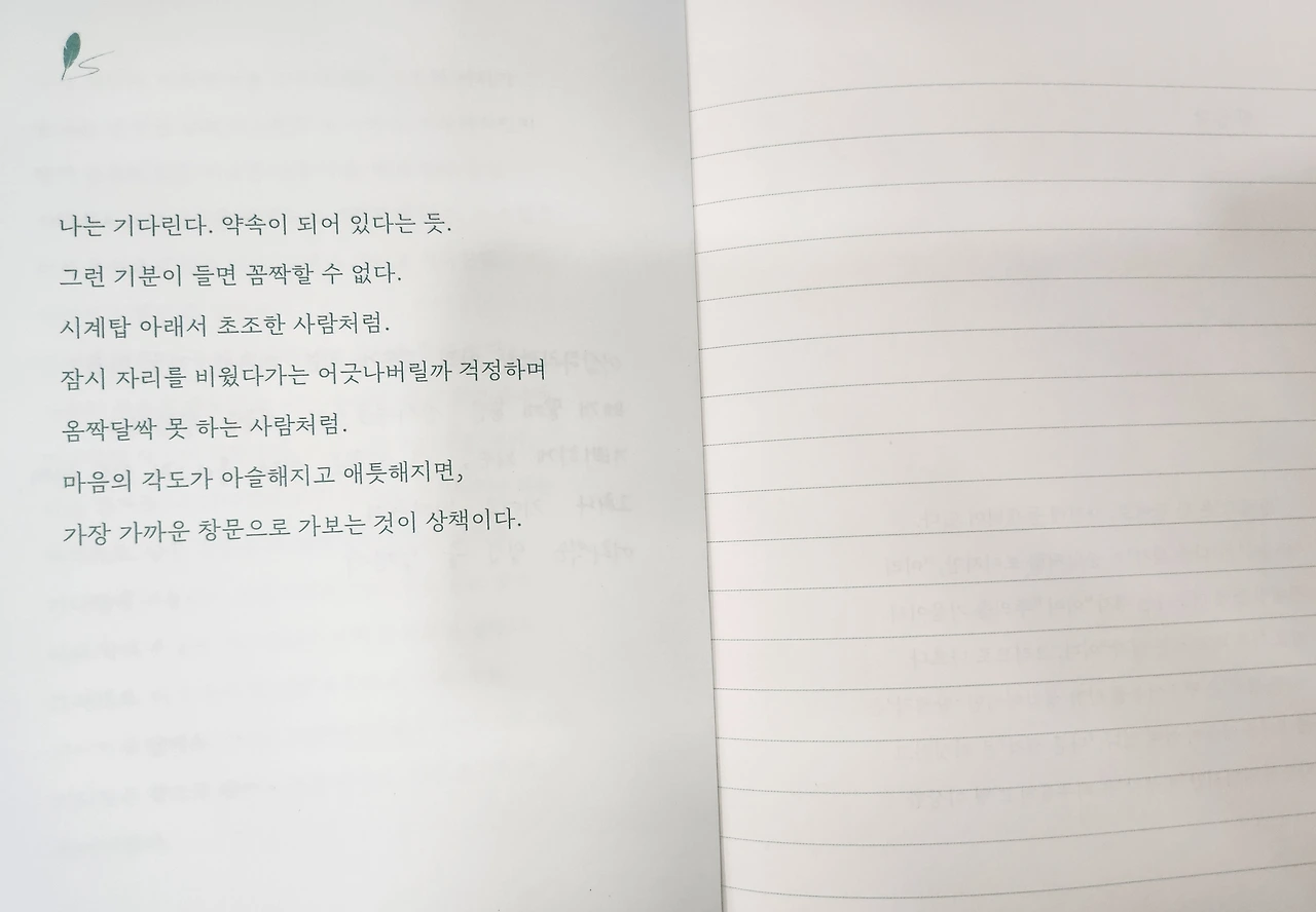 첫 필사 문장 "나는 기다린다. 약속이 되어 있다는 듯. 그런 기분이 들면 꼼짝할 수 없다. 시계탑 아래서 초조한 사람처럼. 잠시 자리를 비웠다가 어긋난 버릴까 걱정하며 옴짝달싹 못 하는 사람처럼. 마음의 각도가 아슬해지고 애틋해지면, 가장 가까운 창문으로 가보는 것이 상책이다."를 읽으며 같은 공간 다른 생각의 사람이면 어떤가 하는 생각도 했다. 시집을 사는 사람이라면.