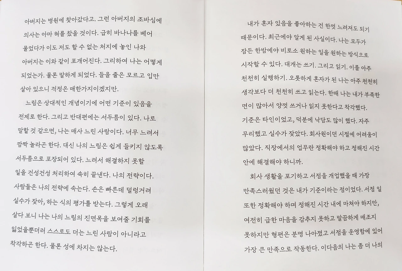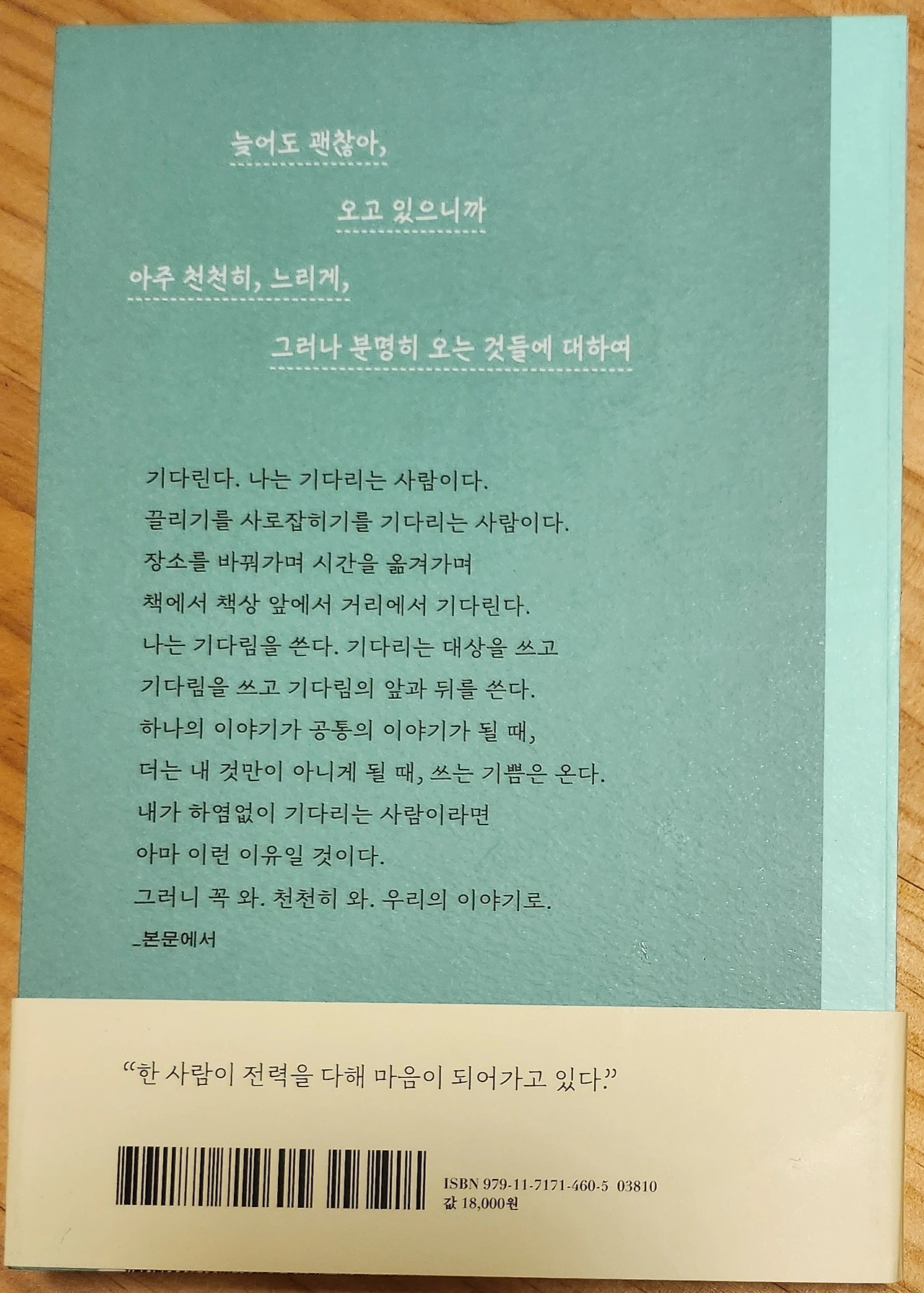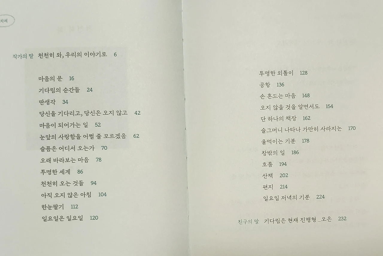 그리고 오은 시인의 문장도 이 책의 마지막 장에 등장했다. "기다림은 마음을 쓰는 일이다. 기다림이 길어질수록 마음은 닳지 않는다. 더 반질반질해진다. 더 바빠지기만 한다. 더 불어나기 일쑤다. 그래서 기다리는 사람은 부자다. 기다림 속에서 사는 사람의 속이 깊어지는 이유다." 이 책을 천천히 읽었으면 하는 지인의 바람도 들어있었다.