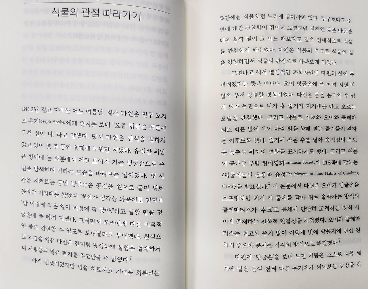 식물을 의인화하거나 은유로 대해오던 관점은 사람의 인문학일 뿐이다. 식물을 대하는 방법 자체마저 완전히 다른 접근이어야만 한다는 것을 조금은 알 것만 같기도 했다. 이를테면 223쪽의 이런 문장에서다. "우리가 다른 대상을 의인화하는 습관에서 벗어나 인간으로서 살아가는 방식이 아닌 다른 방식으로 존재하는 방법을 탐구하며 세상을 이해하려고 하지 않는 한 식물로 존재하는 게 어떤 것인지 알 수 없을 것이다. 이를 위한 열쇠는 신경생물학에 대한 완전한 이해이며, 프로젝트는 현재 진행 중이다. 우리는 우리에만 집중하던 편협한 직감에서 벗어나 어두운 세상에서 음파로 세상을 보는 박쥐나 공가 중 햇빛이나 토양 속 무기물을 향하는 식물처럼 다른 종류의 의식으로 주변을 상상해야 한다."
