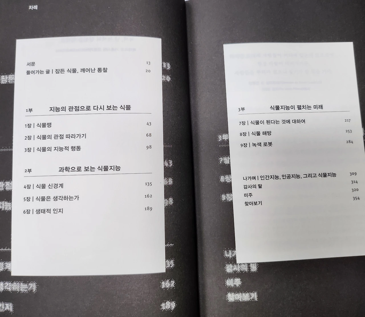 이 책은 3부로 나뉘어 각 3개씩의 주제가 담겨있다. 지능의 관점에서 본 식물, 과학적 관점의 식물 지능과 식물 지능과 미래와의 연결이 지은이 파코 칼보의 이야기로 쓰여있다.