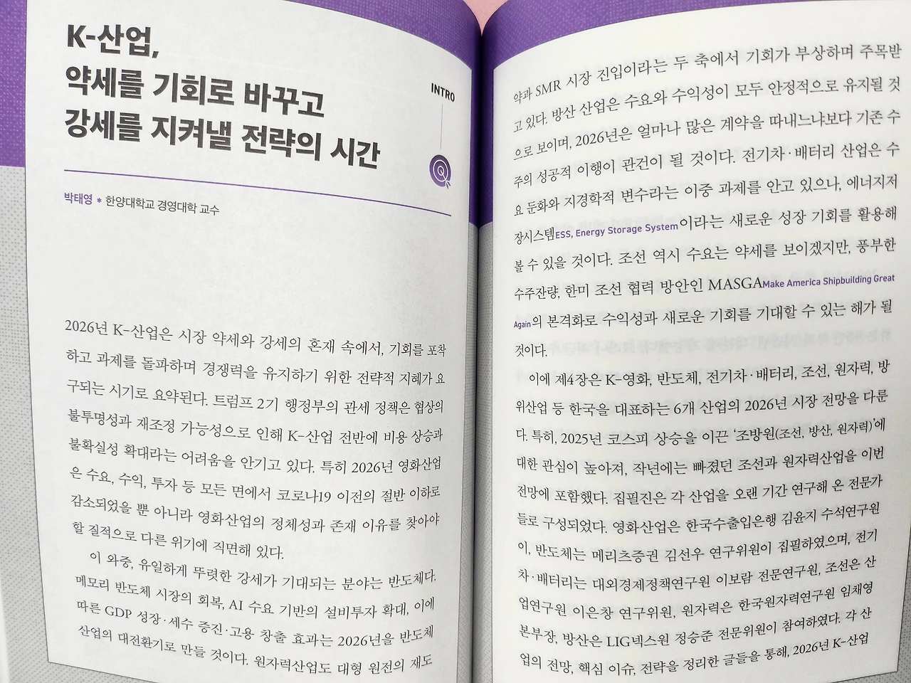2026년 한국경제의 대전망을 예측하면서 변곡점을 가져올 5대 변수는 미국 트럼프 정부의 관세 폭탄, 달러 스테이블코인, 변화하는 중국이 가져올 한중관광, 서비타이제이션(servitization)의 가속화, 중소기업의 성장 전략이라고 한다. 이와 함께 K-산업으로 약세를 기회로 바꾸는 전략적 지혜가 요구되는 시기가 될 것이라고 전망하고 있다. 뚜렷한 강세는 반도체이며 방산 산업도 약진을 하는 중이다. 영화, 전기차 및 배터리, 조선, 원자력 등 6개 산업은 K-산업의 중요 분야다. 그리고 주변국의 변화도 함께 바라볼 필요가 있다.