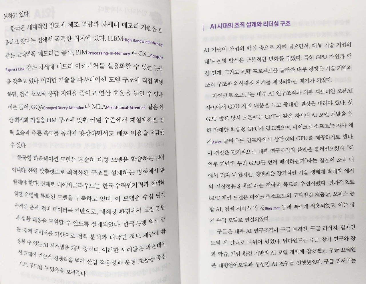 소버린 AI는 국가 산업구조, 전력망, 반도체 설계, 데이터 센터 구성, 통신 인프라, 법 제도 환경까지 포함해 최적화된 AI 생태계를 구축하고 운영하는 것을 뜻한다. 소버린 AI 모델을 보유하면 제약에서 벗어날 수 있다. 국내 전력망 데이터 센터 반도체 구조에 맞춰 설계된 모델은 전력 효율성을 높이고 운영 비용을 줄이며 응답 속도를 개선할 수 있다. 소버린 AI를 확보하면 산업구조와 인프라를 우리 조건에 맞춰 설계하고 이를 기반으로 해외 시장에도 확장할 수 있는 여지가 생긴다. 따라서 소버린 AI는 선택의 문제가 아니라 필연의 문제다. 29쪽~31쪽