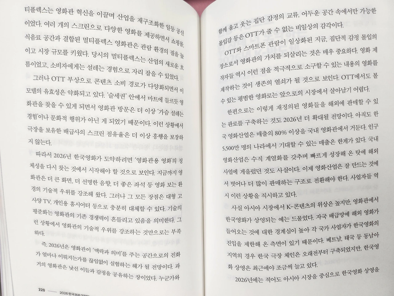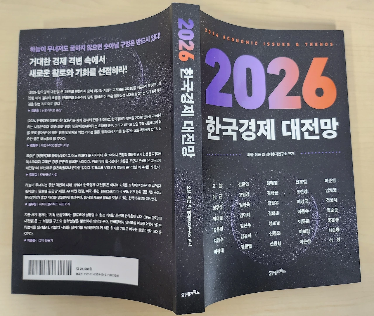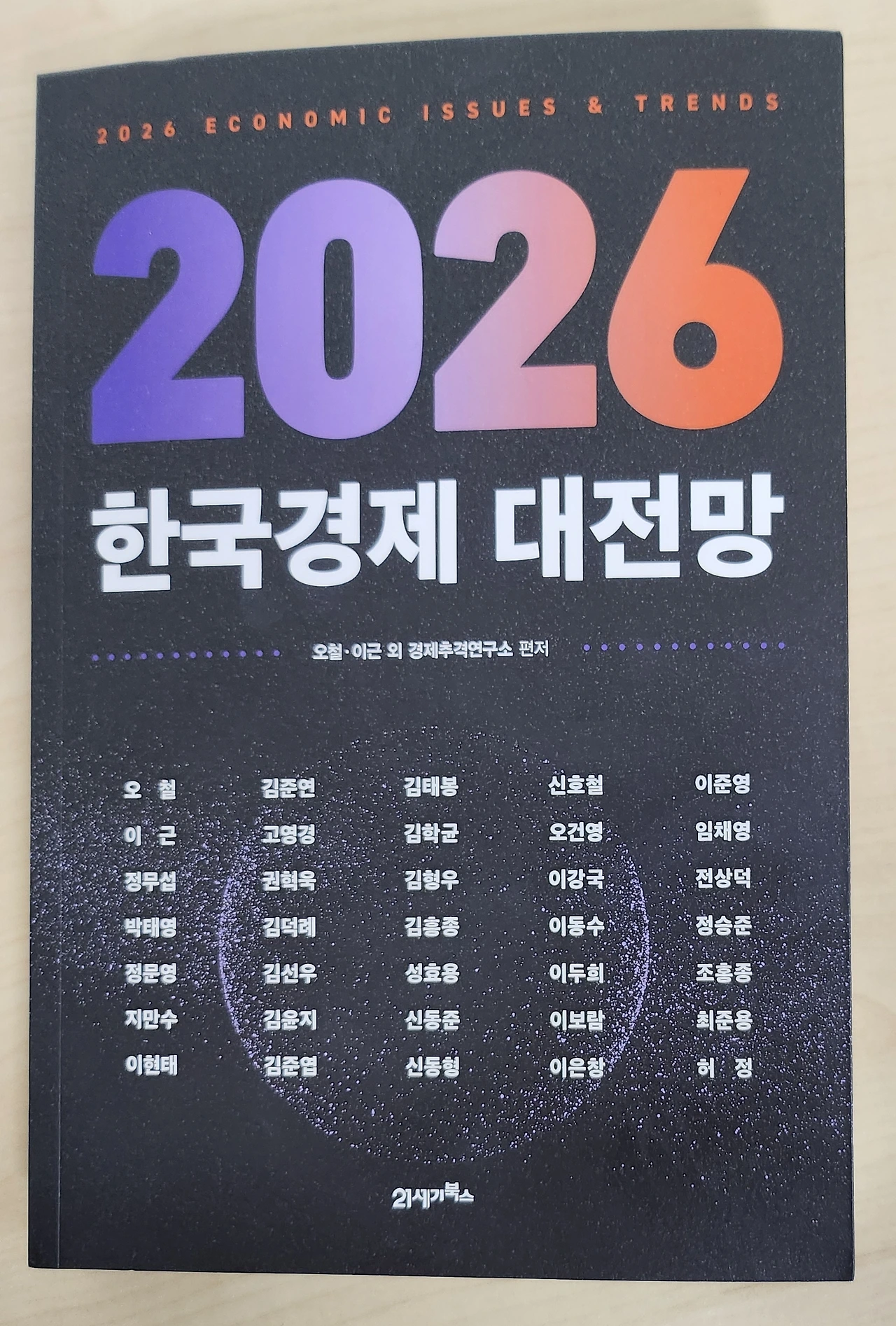 그런 의미에서 <2026 한국경제 대전망, 오철, 이근 외 경제추격연구소 편저, 21세기 북스>는 서둘러 읽고 싶은 책이다. 검정 표지에 곧 들어설 내년 2026년이 여명처럼 보랏빛에서 선홍빛으로 새겨져 있다.