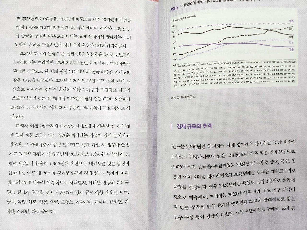 한국은 최근 미국에 대한 추격은 거의 정체된 상태이지만 적어도 미국과 유사한 수준으로 1인당 GDP가 성장하고 있기 때문에 미국에 비해 성장률이 뒤처지고 있는 일본과 유럽에 대한 추격 및 추월은 지속하는 상황이다. 1990년대 이후 IT, 소프트웨어, 인터넷 기반 비즈니스를 거의 독점한 미국이 AI 분야에서도 다른 선진국을 앞서 나가면서 선진국 내부에서도 미국 독주 현상이 나타나는 것에 대해 많은 논의가 있지만, 한국 역시 일본이나 유럽처럼 미국보다 성장세가 뒤처지지 않도록 다각도의 노력이 필요하다. 한편, 경상 GDP로 본 세계 경제에서 차지하는 한국 경제의 비중은 2020년 이후 원화 가치 하락, 경기 침체, 침체 인구 감소 등의 효과로 지속적 하락 추세인데, 2020년 2.1%의 비중으로 세계 9위였지만 2025년과 2026년에는 1.6%의 비중으로 세계 10위권에서 하락하여 13위를 기록할 전망이다. 새 정부의 경기 부양책과 경제 정책의 성과에 따라 한국의 GDP 비중이 지속적으로 하락할지 아니면 반등의 계기를 맞게 될지가 결정될 것이다. 2025년 경제 규모 예상 순위는 미국, 중국, 독일, 인도, 일본, 영국, 프랑스, 이탈리아, 캐나다, 브라질, 러시아, 스페인, 한국 순이다. 333쪽~336쪽