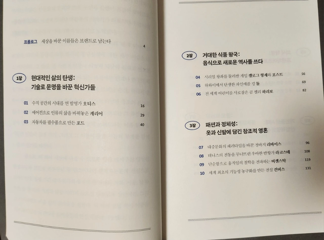 책의 주인공이 된 22명의 이름은 이미 생활에서 익숙한 물건의 이름이거나 상표다. 편리한 물건이나 상표가 창업자이거나 그 물건을 개발한 누군가의 이름이라는 것은 흥미롭게 느껴졌다. 이름이 하나의 브랜드가 된 사람들의 이야기는 더 궁금해졌다. 나는 책의 표지를 느껴보는 것을 좋아하지만 이번엔 그들의 삶이 궁금해서 홀리듯 책을 펴고 그 자리에서 읽기 시작했다.