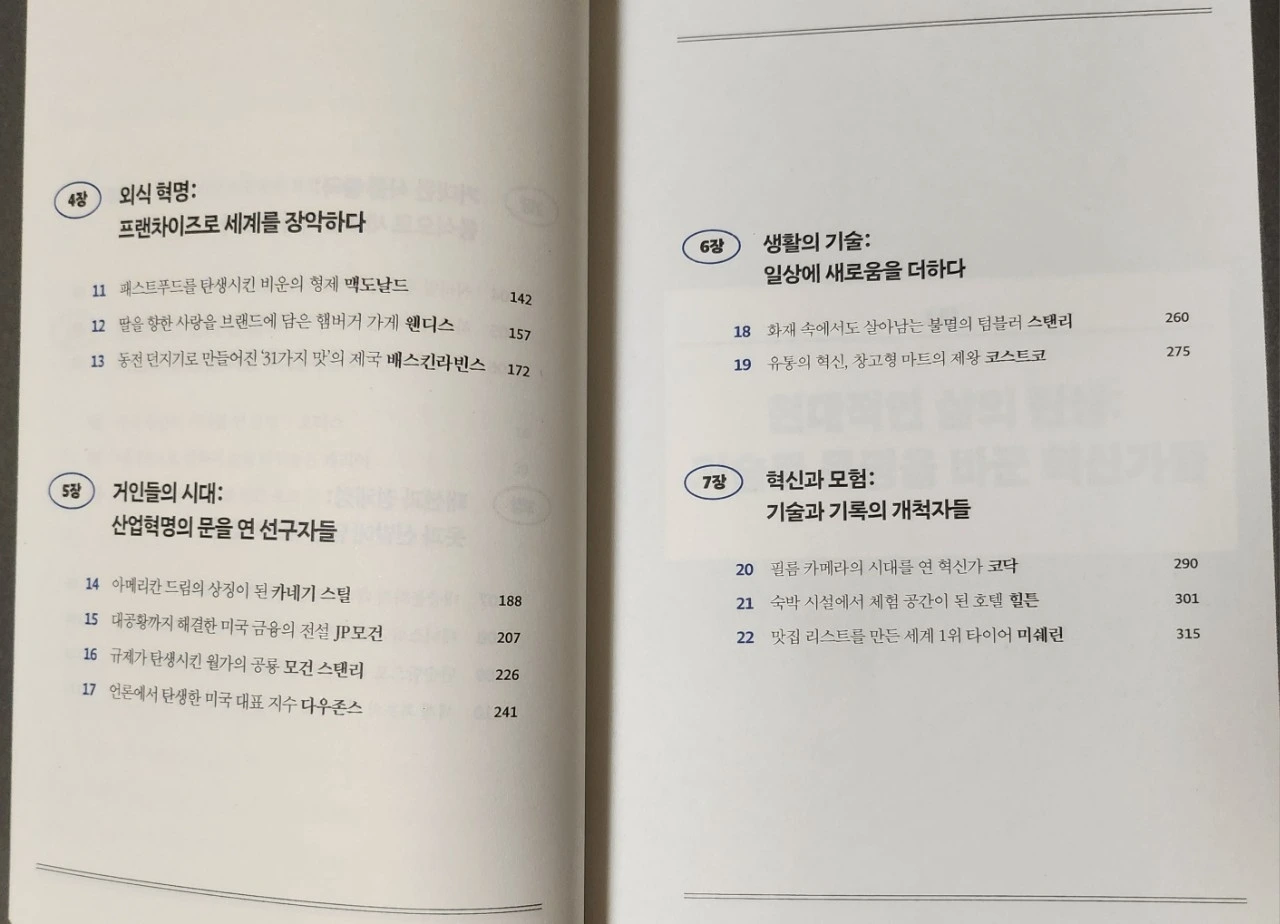 이 책에는 기계, 식품, 패션, 외식산업, 산업혁명, 일상의 새로움, 기술과 기록을 개척한 사람이라는 7개의 꼭지에 22개의 패러다임이 구체적이고 수려한 문장으로 나와 있다.