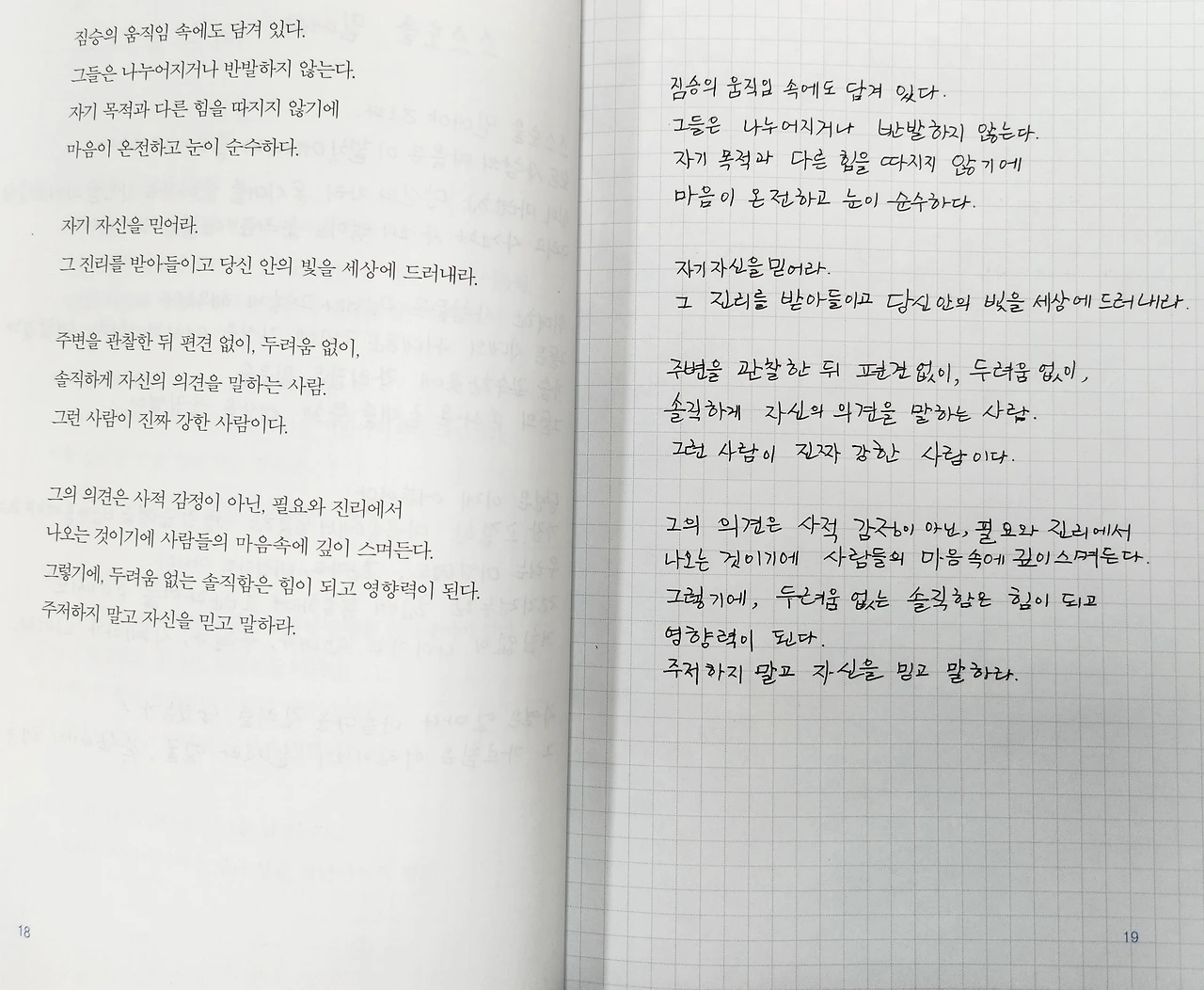 이 책의 필사는 자기 신뢰, 운명, 개혁하는 인간, 인간관계의 순서로 안내된다. 왼쪽에는 에머슨의 문장이 오른쪽 빈 페이지에는 필사할 수 있는 여백이 있는 매력적인 책이다.