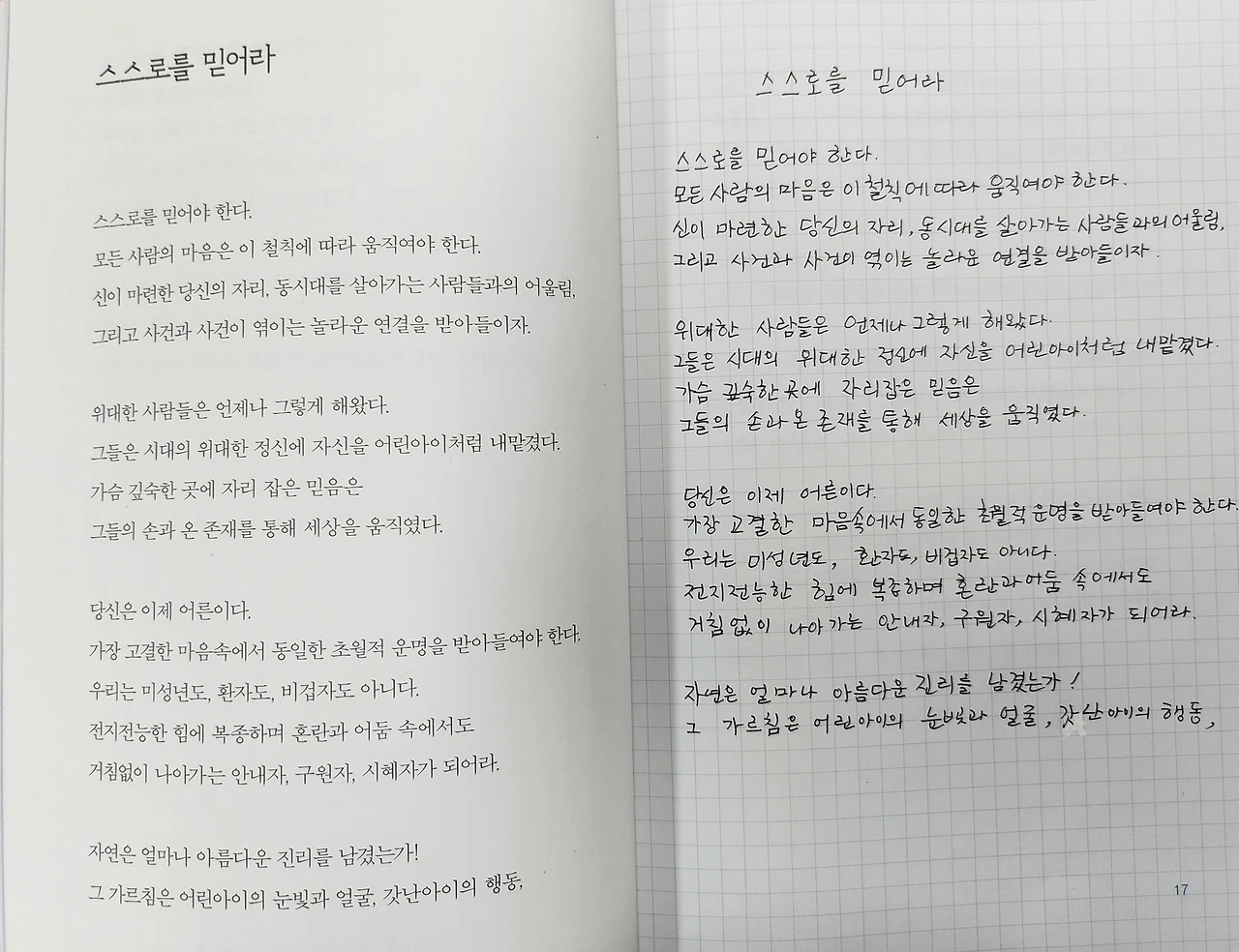 나는 '스스로를 믿어라'는 문장이 마음에 닿아 필사를 해보았다. 그리고 친구와 관련된 이런 문장은 정말이지 너무나 아름다워서 눈물이 날 것만 같았다.
