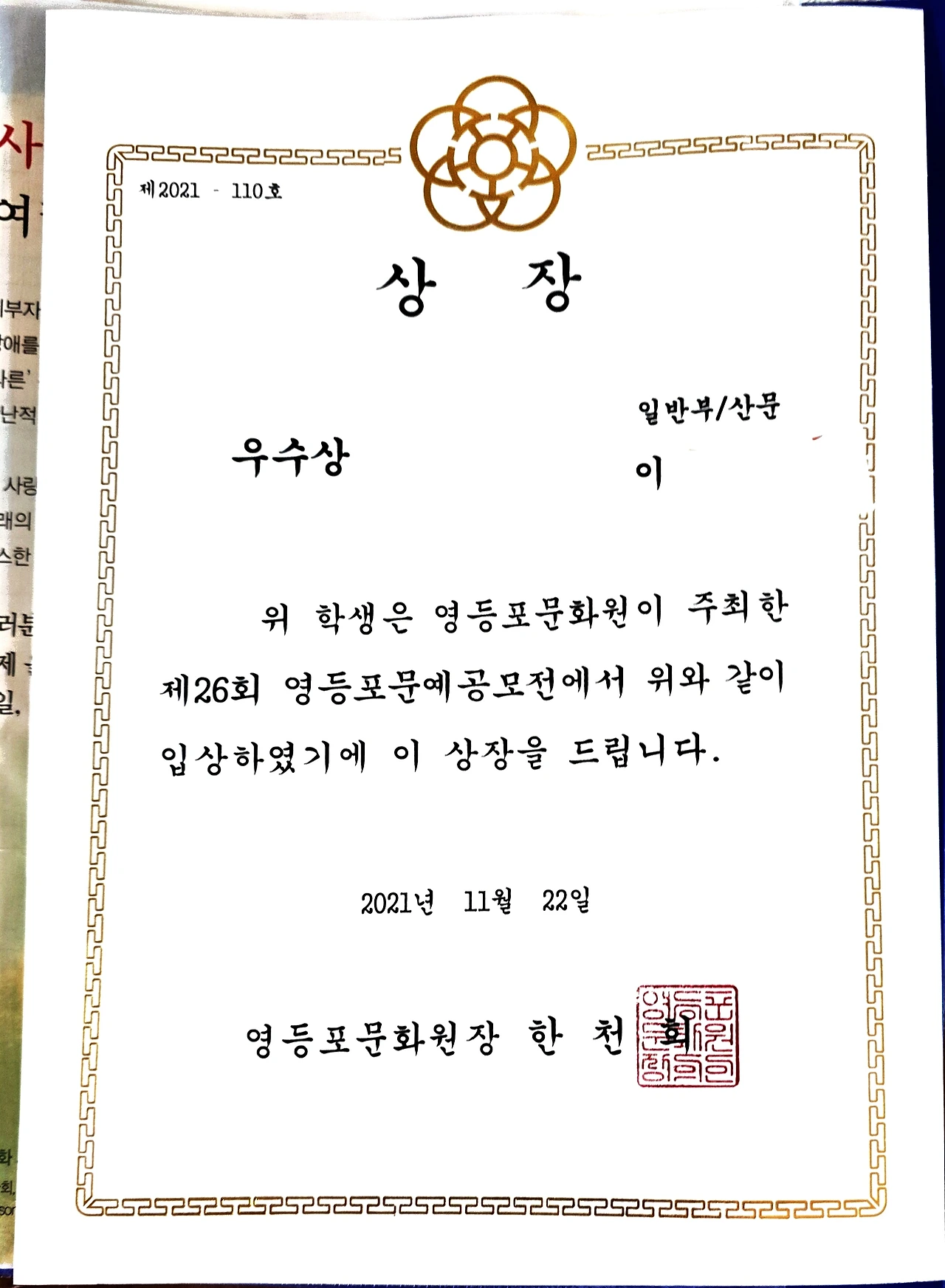 (무조건 배우고, 글을 써서 공모도 해 상장도 받고 상금도 받아보는 시니어