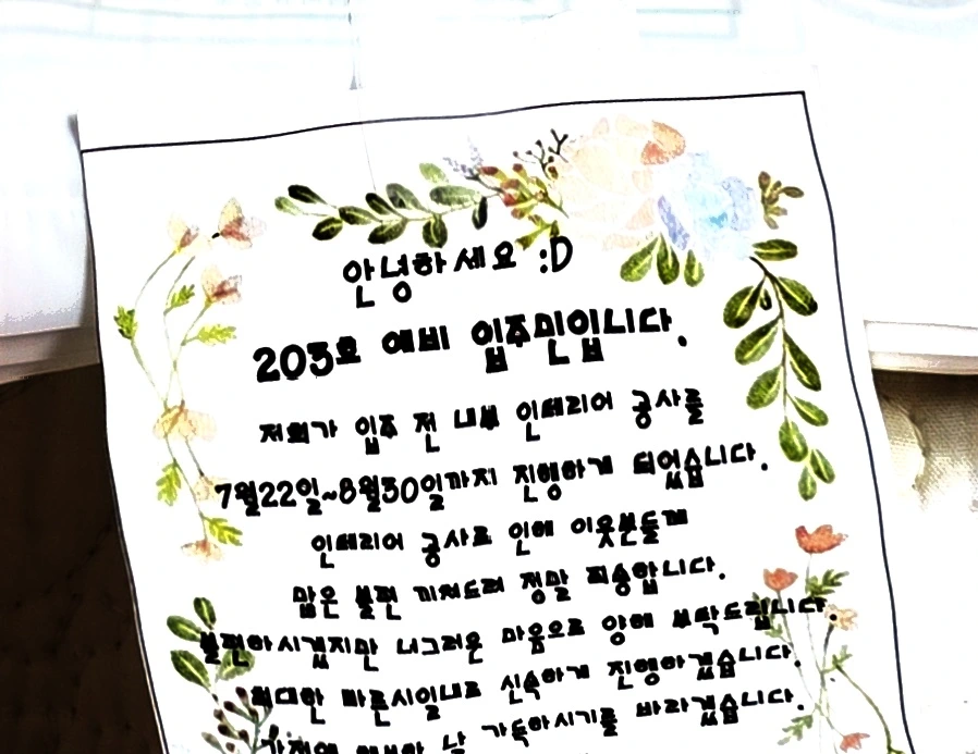 쪽지에 적힌 글자를 읽어보니 203호실 입주예정자인데 일주일 동안 미리 리모델링 공사를