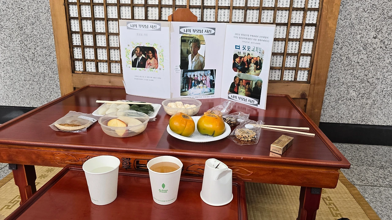 아내가. 준비해 준. 송편과 과일들을 진설하여