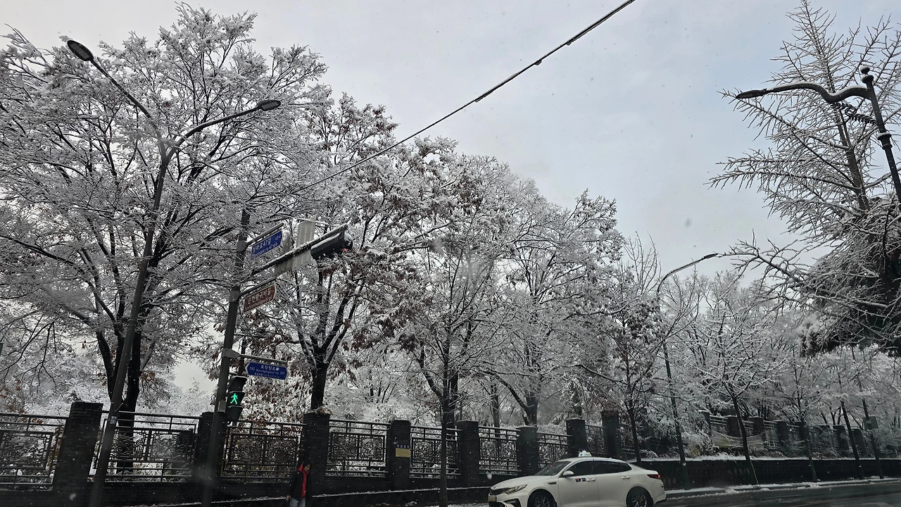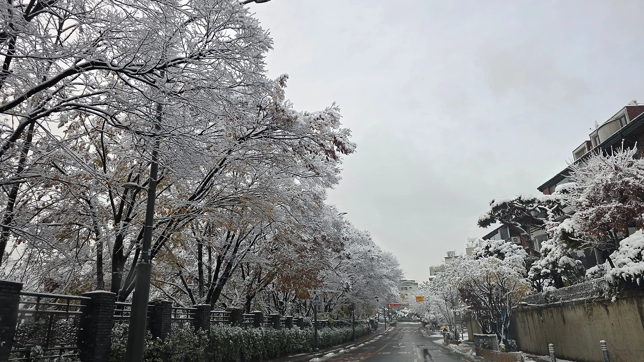 가로수에 백설처럼 소복하게 아름답게 쌓인 첫눈을