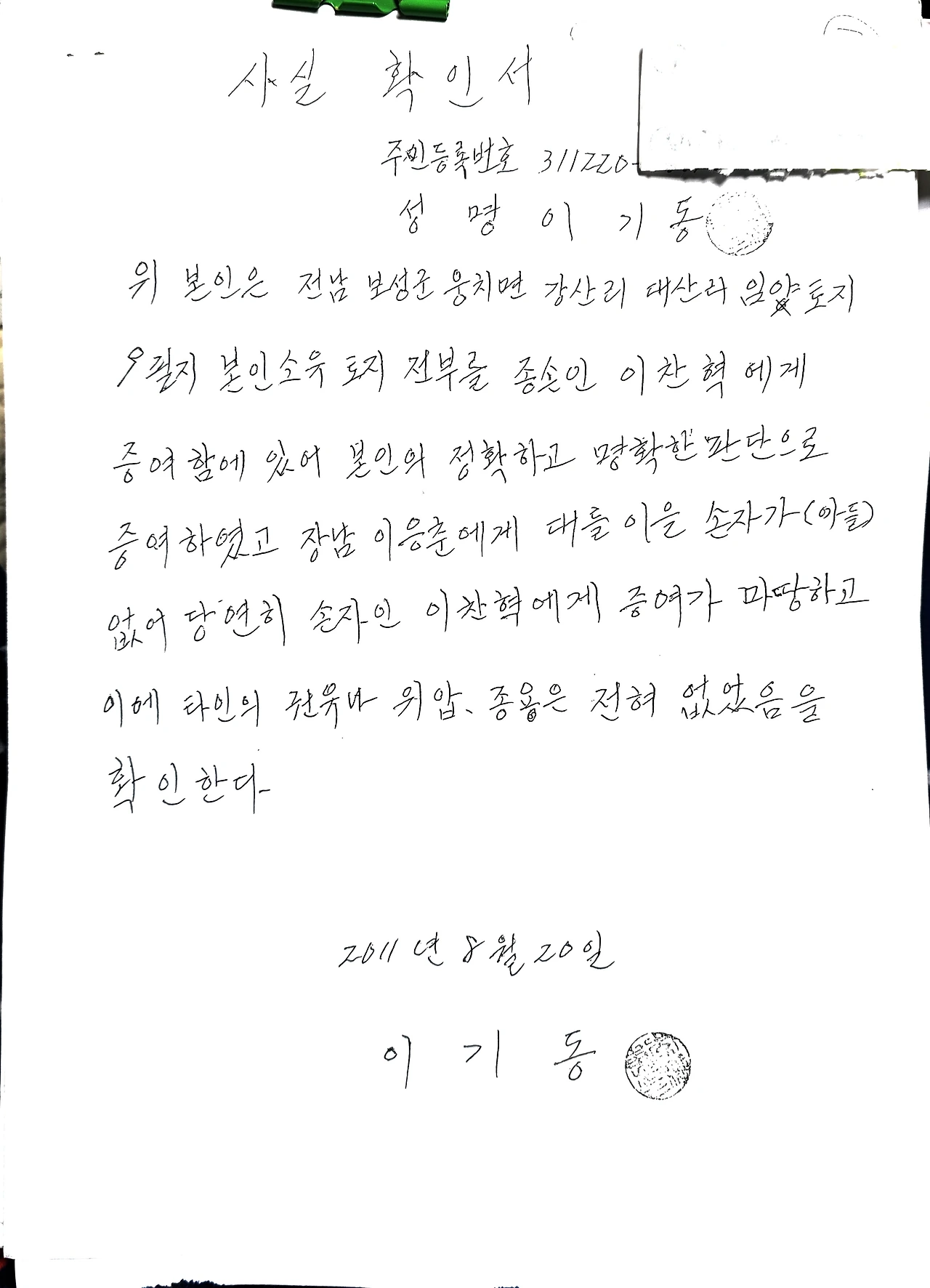 다른 자식들 몰래 전ㆍ답을 다 팔아 둘째 아들의