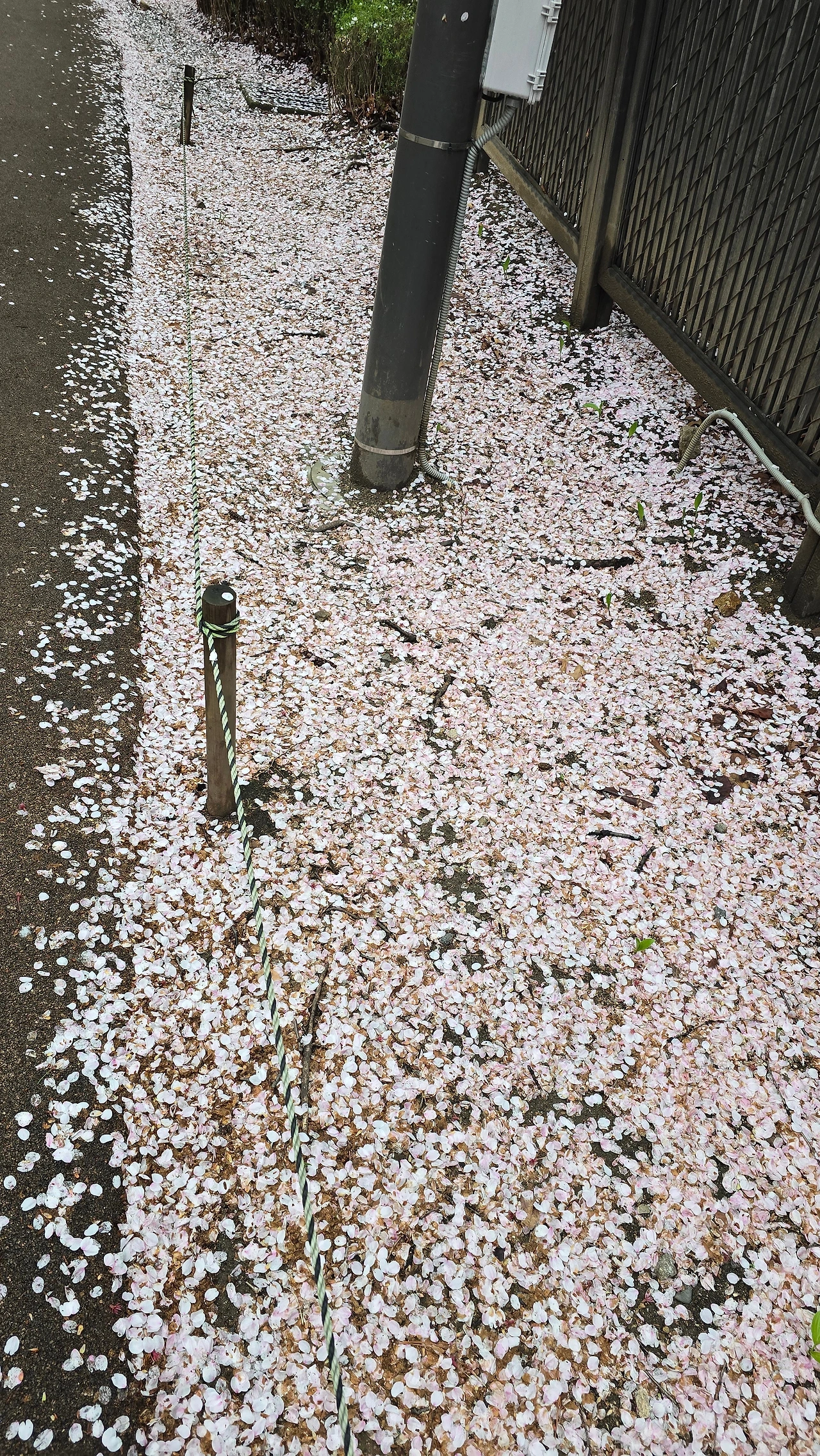 축축하게 젖은 아스팔트 바닥 위는 이미 먼저 내려앉은 꽃잎들로 수를 놓아, 마치 연분홍색 융단을 깔아놓은 듯합니다.
