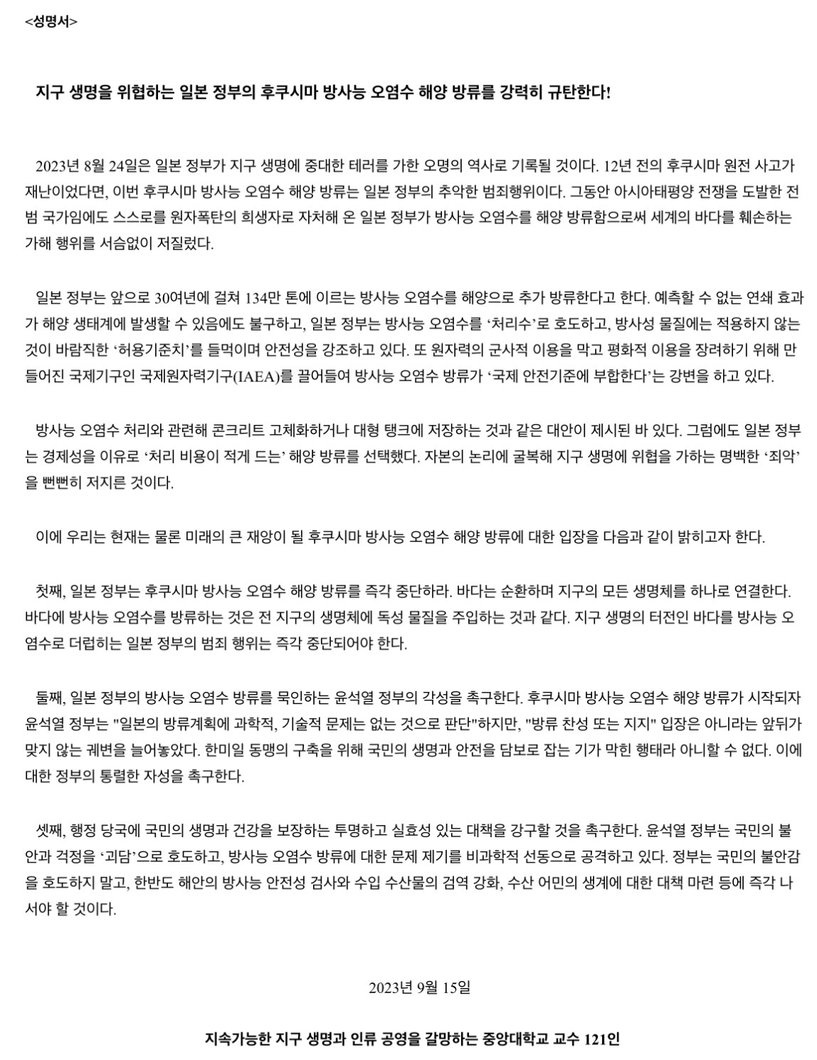 “정부는 자체 비축 76,000 t에 민간 유통업자에게 저금리로 돈을 빌려줘 130,000 t 수준으로 수산물 수매를 유도하겠다는 대책을 내놓았지만 전체 생산량을 보면 턱없이 낮은 수준이다. 일본이 방류했더라도 우리 바다까지 오는 시간은 아직 남아 있으니 우리 정부는 국제재판소 제소 등 최대한 빨리 중지시키려고 노력하라.”