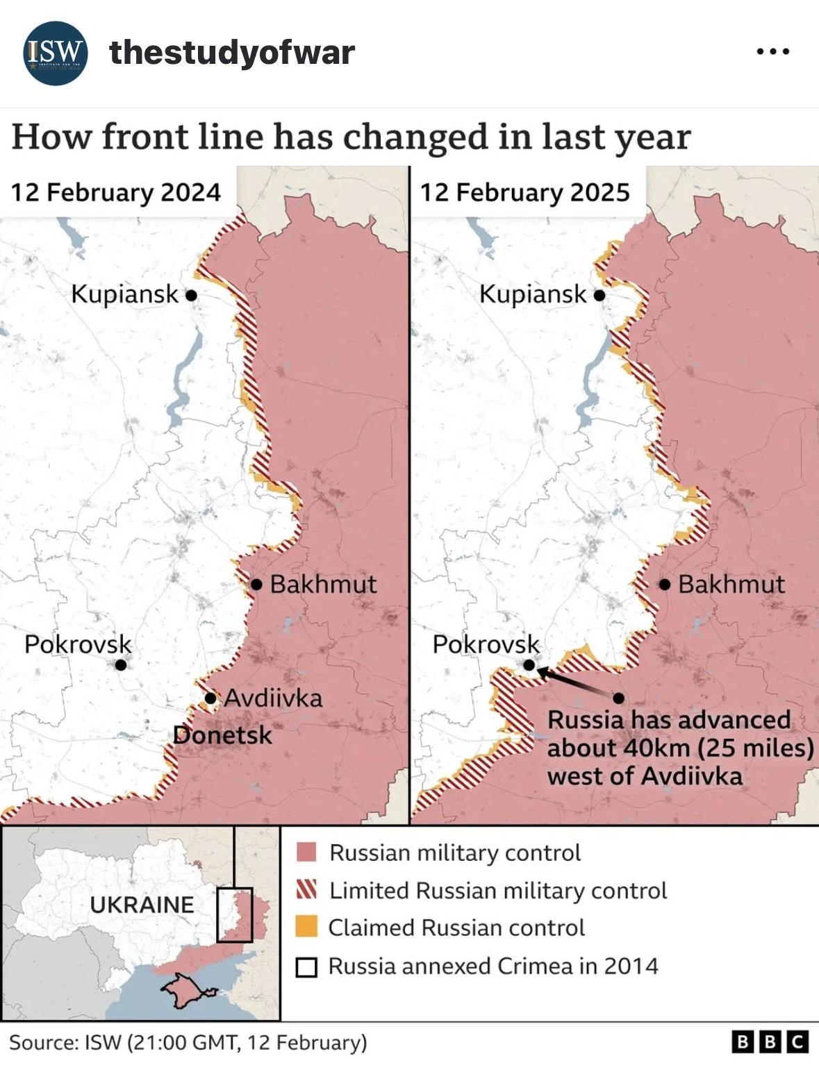 위 사진은 바로 앞서 제시한 2023년 12월로부터 약 1년 2개월 이후의 시점인 2025년 2월 12일 러시아군의 전반적인 점령지 영상을 보여주는 지도다. 1년 2개월 동안 눈에 띄는 차이라고는 도네츠크주 방면에서 포크로우스를 향해 살짝 튀어나와 있는 돌출부가 전부다.