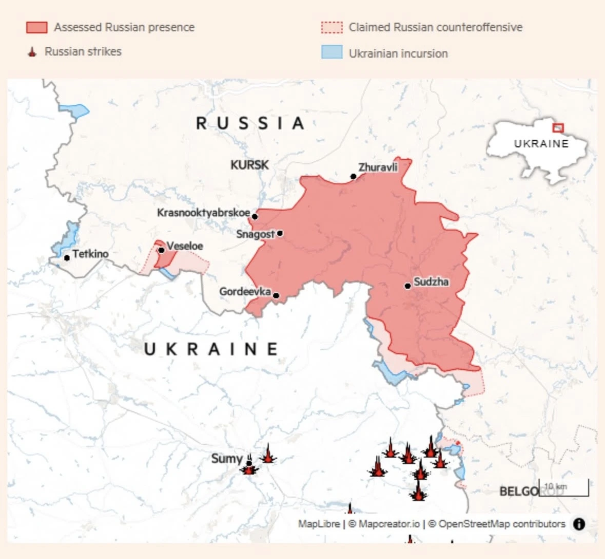 오히려 눈에 띄는 변화는 쿠르스크주 내 우크라이나의 점령지 축소다. 아래 영상은 2024년 8월 11일부터 2025년 3월 12일까지 쿠르스크주 내 우크라이나의 점령지 변화 영상을 보여준다.