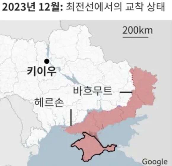 위 사진은 러시아군이 동부전선에서 공세를 가해 바흐무트를 함락시킨 2023년 12월의 모습을 보여준다.