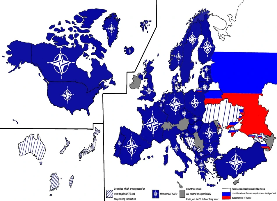 러시아와 나토의 세력 범위를 한 번 살펴보자. 나토 문양이 그려져 있는 국가나 지역은 나토 세력이고, 회색으로 칠해져 있는 국가는 나토나 러시아 둘 중 어느 세력에도 속하지 않는 국가이며, 러시아 국기가 그려져 있는 국가나 지역은 러시아의 세력 범위이고, 파란색으로 빗금이 칠해져 있는 국가는 나토 회원국은 아니지만 가입을 희망하거나 또는 나토와 협력하는 국가임을 의미한다.