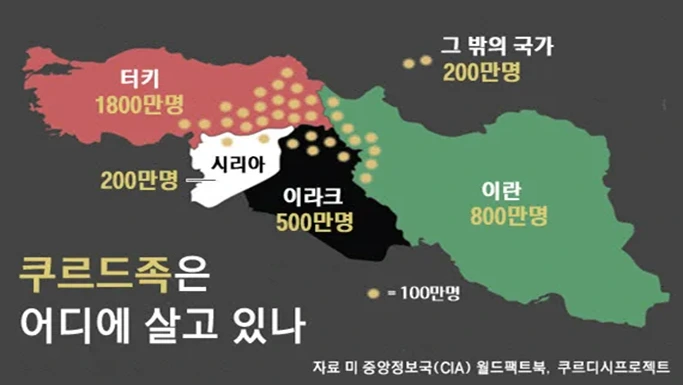참고로 2022년 5월은 2023년 5월에 있었던 튀르키예 대선을 1년가량 앞두고 있었던 시점이었다. 왜 에르도안이 이때 시리아 내전에 개입하려 했냐면 바로 쿠르드족 문제 때문이었다. 에르도안은 튀르키예식 민족주의를 국내 정치에서의 소재로 빈번히 사용하는데 그때마다 들고 나오는 것이 쿠르드족 이슈다. 왜냐하면 쿠르드족은 튀르키예와 시리아 사이의 남동부 국경 쪽에 밀집되어 있으며 독립국을 형성하고 싶어 하기에 튀르키예로부터 독립을 요구하고 있고 튀르키예를 상대로 무장 투쟁도 하고 있기 때문이다. 아래는 쿠르드족 분포도다. 노란색 점이 쿠르드족의 분포를 의미한다. 아래 지도에서 볼 수 있듯 이라크 북동쪽에는 벌써 쿠르드족이 쿠르디스탄이라는 국가까지 건국했다. (번외로 미국은 쿠르드족의 독립을 지지하기도 했었으나 튀르키예가 나토 회원국인 데다 현시점에서 러시아를 남쪽에서 견제하려면 튀르키예가 필수적이기 때문에 미국은 불가피하게 쿠르드족에 대한 지원을 철회했다.)
