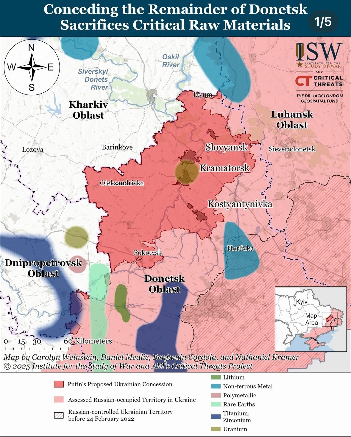 또한 위 지도를 통해 러시아가 점령한 점령지(진한 빨간색 부분 제외, 연한 빨간색만 해당)에 묻혀있는 광물들을 살펴보자. 희토류(민트색)부터 시작해, 리튬(진한 연두색), 티타늄•지크로늄(남색), 비철금속(구리, 아연, 알류미늄, 니켈 등/진한 하늘색)의 매장지가 다수 분포해있다. 이대로 점령지가 굳혀 진다면 전부 다 러시아가 광물을 독점하게 된다. 이러한 자원을 중국처럼 무기화해 자원 외교를 구사하면 유럽은 큰 타격을 입을 수밖에 없다.(이미 유럽에 대한 러시아의 천연가스무기화로 그 사실은 입증되었다.)