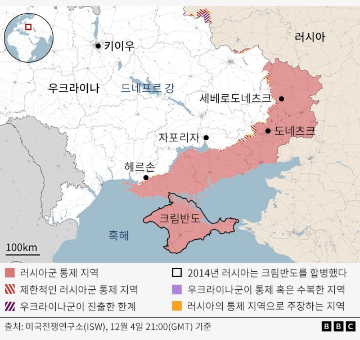 위는 2022년 9월과 10/11월에 우크라이나가 반격함으로써 헤르손과 하르키우를 수복한 상황을 요약한 것이다.