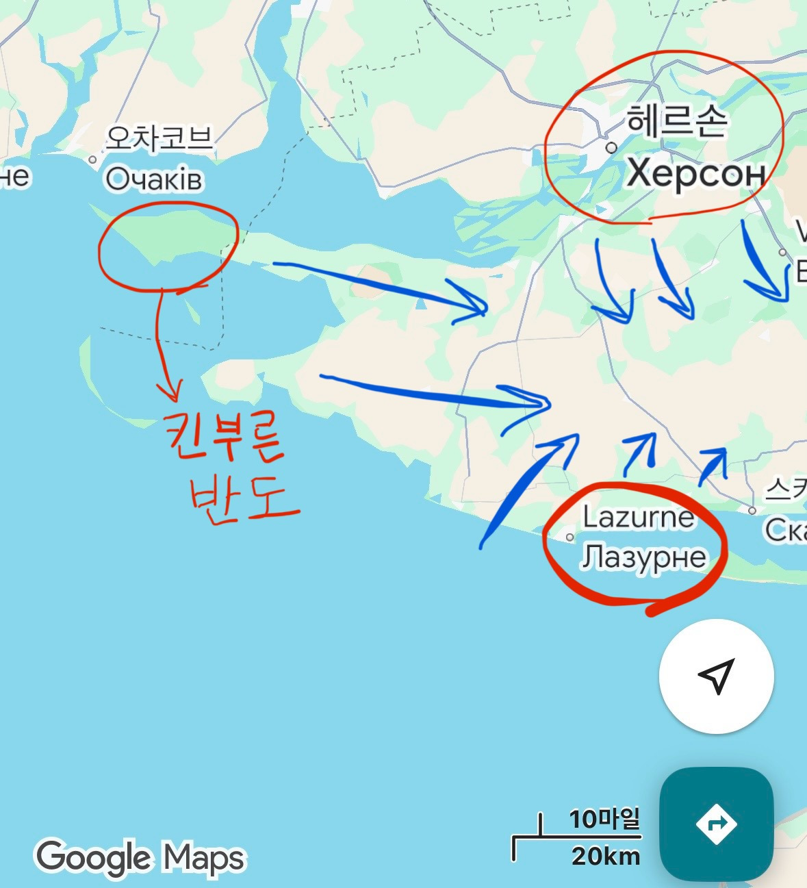 이렇게 헤르손 부근에 상륙 지점이 확보되면 본격적인 상륙작전을 감행한다. 킨부른 반도나 헤르손 주 후방에 마련한 상륙 거점을 바탕으로 점령지를 확대하고 멜리토폴을 향해 측면과 후면에서 진격하며 기습 효과를 노린다. 그렇게 하여금 러시아의 남부 점령지와 크림 반도를 잇는 보급로를 차단한다. 당황한 러시아군은 분명히 병력을 재배치할 것이고 동부 돈바스 전선에서 병력을 빼돌려 헤르손 주 측면과 후면에서 치고 들어오는 우크라이나의 공세를 막는데 집중할 것이다. 그러면 이때 자포리자 주 전면에서 드니프로 강을 동시다발적으로 도하해 러시아군을 서쪽과 북쪽 남쪽 세 방면에서 포위한다. 그렇게 해서 헤르손 주 전역을 탈환해 자포리자 주까지 밀고 들어가 러시아 본토-돈바스-크림반도를 잇는 육로 회랑을 차단하는 것이다. 만약 여력이 안 된다면 자포리자 주까지 밀지 말고 헤르손 주만 탈환해도 남부 육상 회로는 충분히 끊을 수 있다. 그러고 나머지 자포리자 주는 협상으로 들고 오면 된다. 즉, 최소 목표가 헤르손 주 탈환 최대 목표가 자포리자 주 탈환인 것이다.