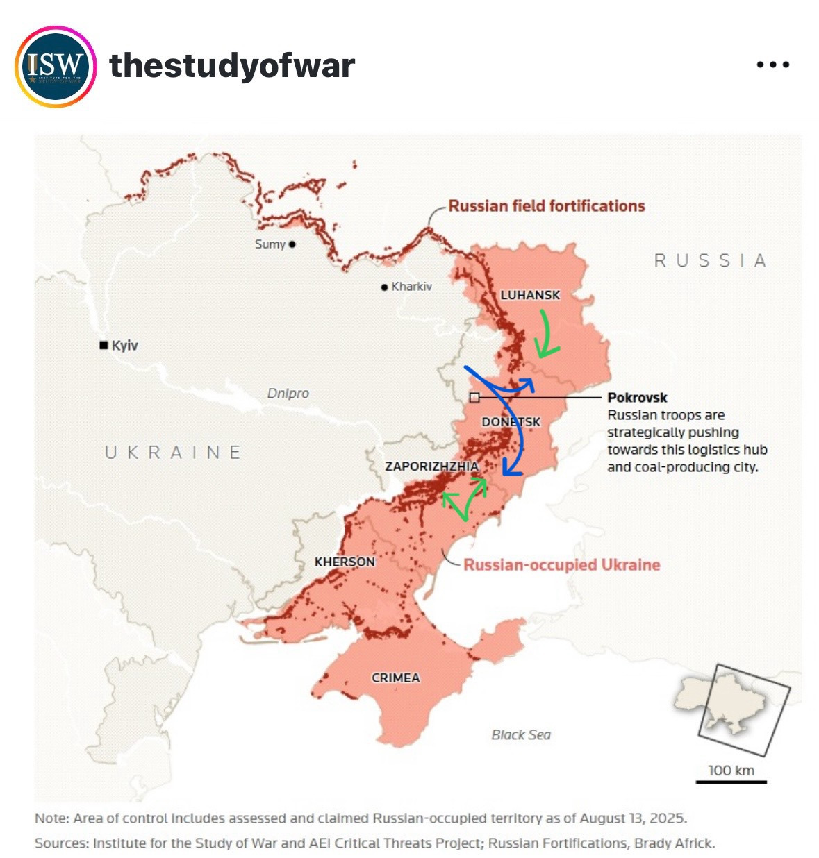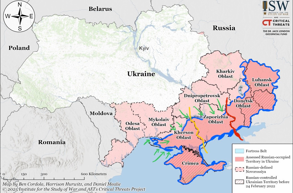 물론 위 사진을 보면 약한 부분이 또 있기는 하다. 바로 도네츠크 북부 쪽이다. 여기를 공격해 자포리자 주 측면을 파고들면 역시나 헤르손을 파고들 때처럼 크림반도와 러시아 본토를 잇는 남부 육로 또한 끊을 수는 있다. 문제는 우크라이나군이 여기를 파고들 경우 일단 공세를 위한 병력을 크게 양분해야 한다는 것이다. 자포리자 측면을 공격할 부대와 루한스크에서의 러시아군이 자포리자 측면을 파고드는 우크라이나군의 후방을 공격하는 걸 막아줄 부대로 나누어야 한다. 여기서 문제는 이렇게 병력을 양분하면 자포리자 주 측면을 공세하는 우크라이나 부대의 돌파력이 약해진 다는 점이다. 게다가 여기서 관건은 루한스크에서의 러시아군을 얼마나 잘 견제해줄지다. 자칫 잘못하면 러시아 점령지 한가운데서 자포리자 주 측면을 공격하는 우크라이나군이 포위•섬멸당할 가능성도 있다. 자포리자 주 측면 공세가 제대로 안 될 경우 더더욱 그렇다. 또한 설령 성공한다 해도 해방한 점령지를 요새화해야 하며 이 말인 즉슨 공세가 끝나자마자 우크라이나가 수세에 돌입해야 하는 건데 이게 쉽지가 않다. 터를 다져 여러 요새를 만드는데까지 걸리는 시간이 어마어마하다. 그 사이 러시아군이 언제 어디서 공세를 할지도 모르니 불확실성도 크다. 더군다나 그렇게 해도 러시아군의 공세를 막을 수 있을지도 미지수인데다 만약 못 막으면 또는 막는다 해도 푸틴은 전쟁의 명분이었던 돈바스(루한스크+도네츠크)는 무조건 들고 가겠다는 입장이기에 전투를 지속할 것이고 이러면 전쟁만 더 장기화될 것이 분명하다.