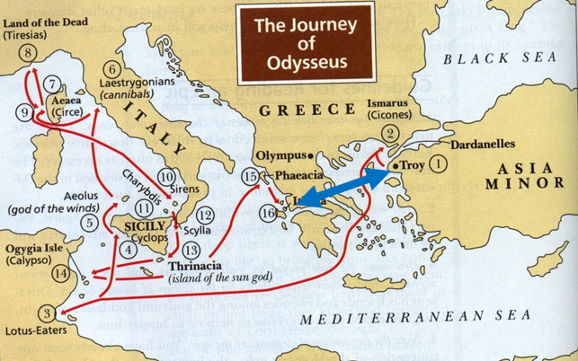 오디세우스의 파란만장한 고생...아닌 모험의 여정. 파란색 화살표가 실제 그가 이동했어야할, 트로이에서 이타카 까지의 거리.